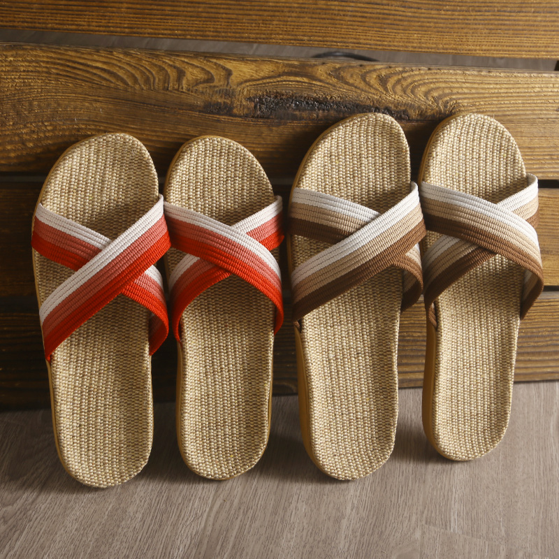 亚麻拖鞋女夏季情侣室内软底防滑交叉带木地板凉拖鞋男夏天居家用