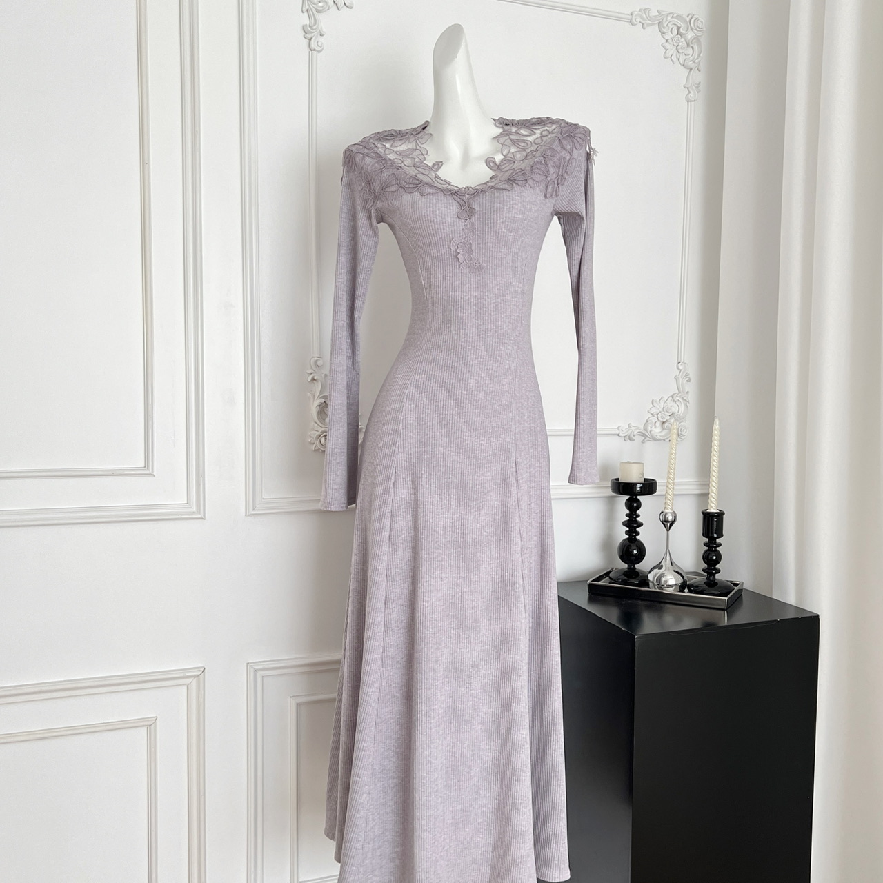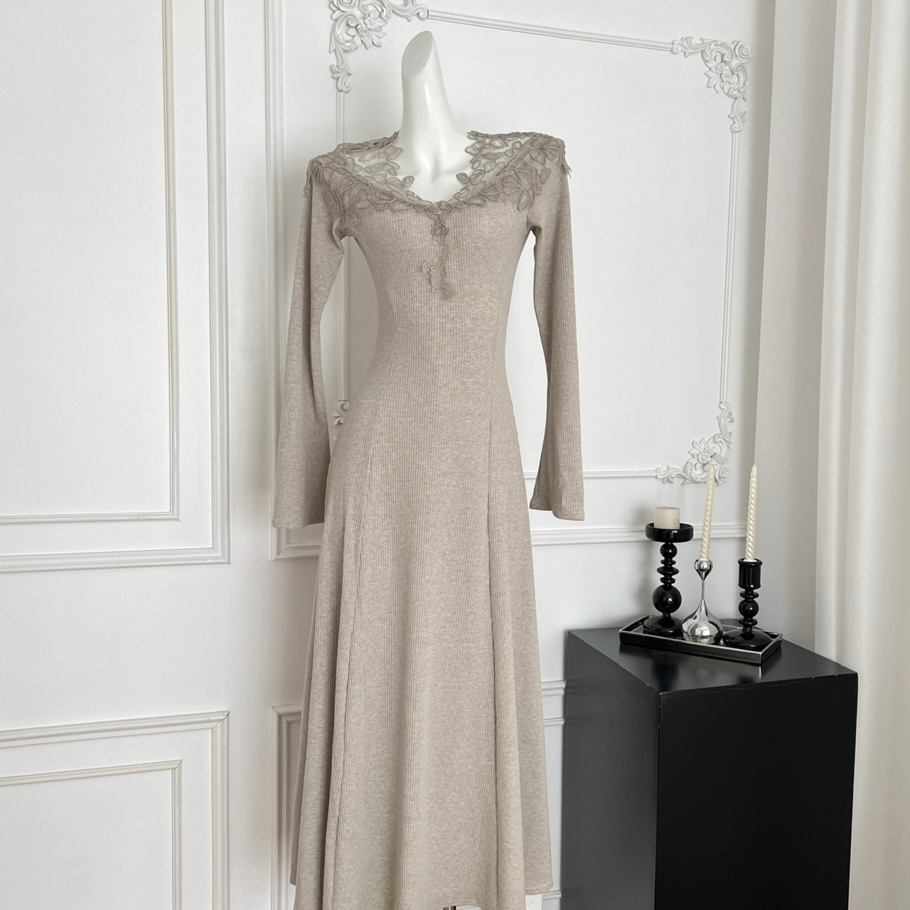 从一时刻不知雪温柔氛围感蕾丝v领针织连衣裙收腰显瘦a摆长裙