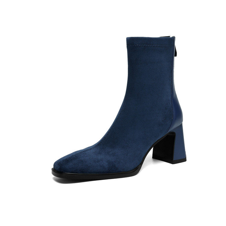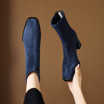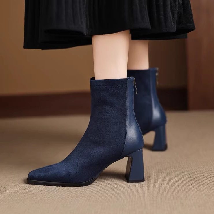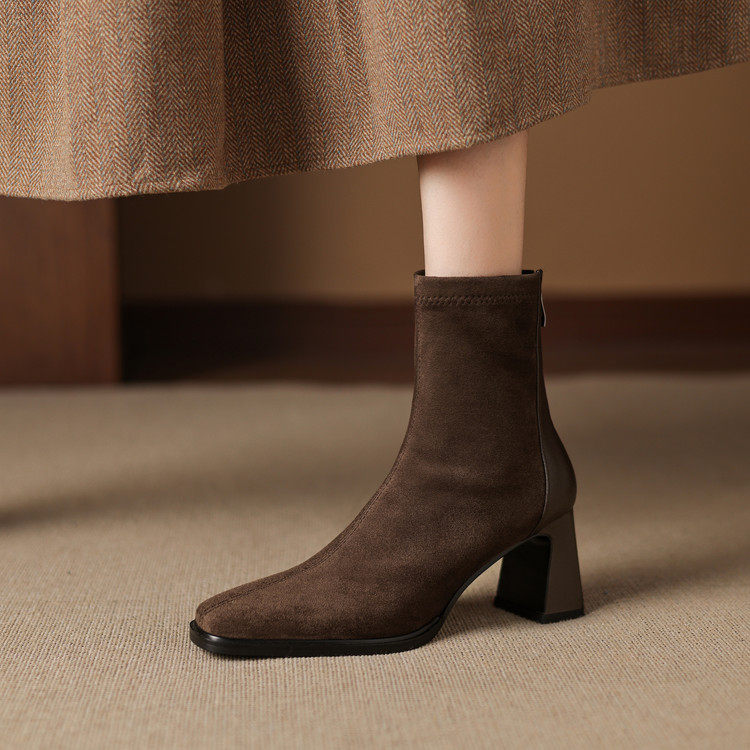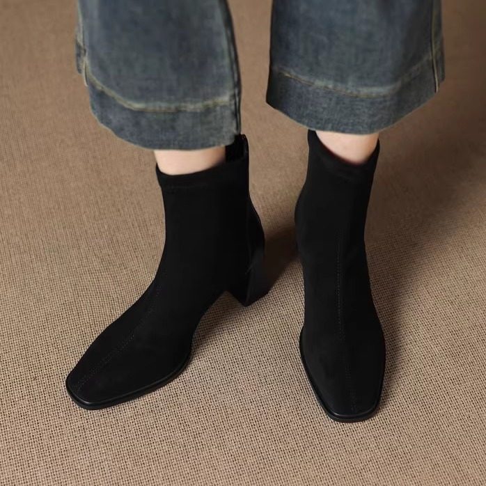 7cm粗跟方头高跟弹力瘦瘦靴女短靴2025年秋冬时尚百搭拼接马丁靴