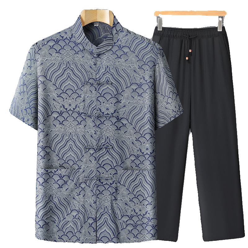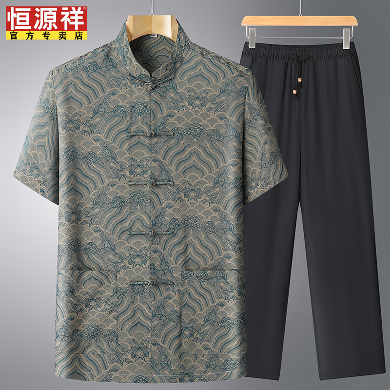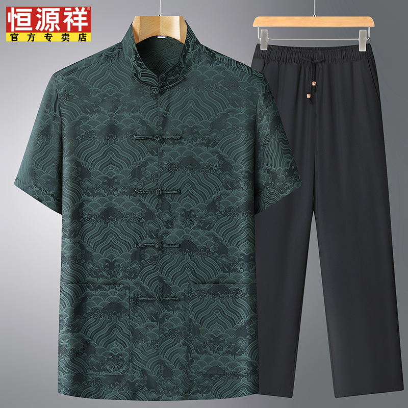 恒源祥中老年短袖唐装男真丝套装