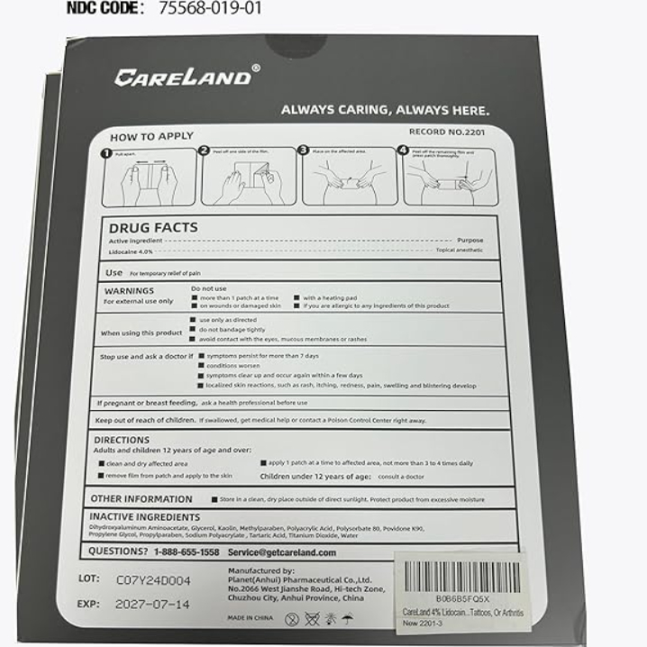 CareLand 4% Lidocaine Gel Patch, 18 Count | Maximum Stren