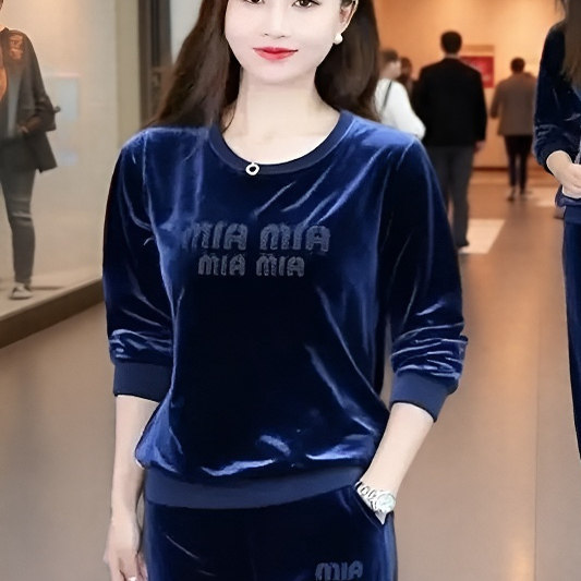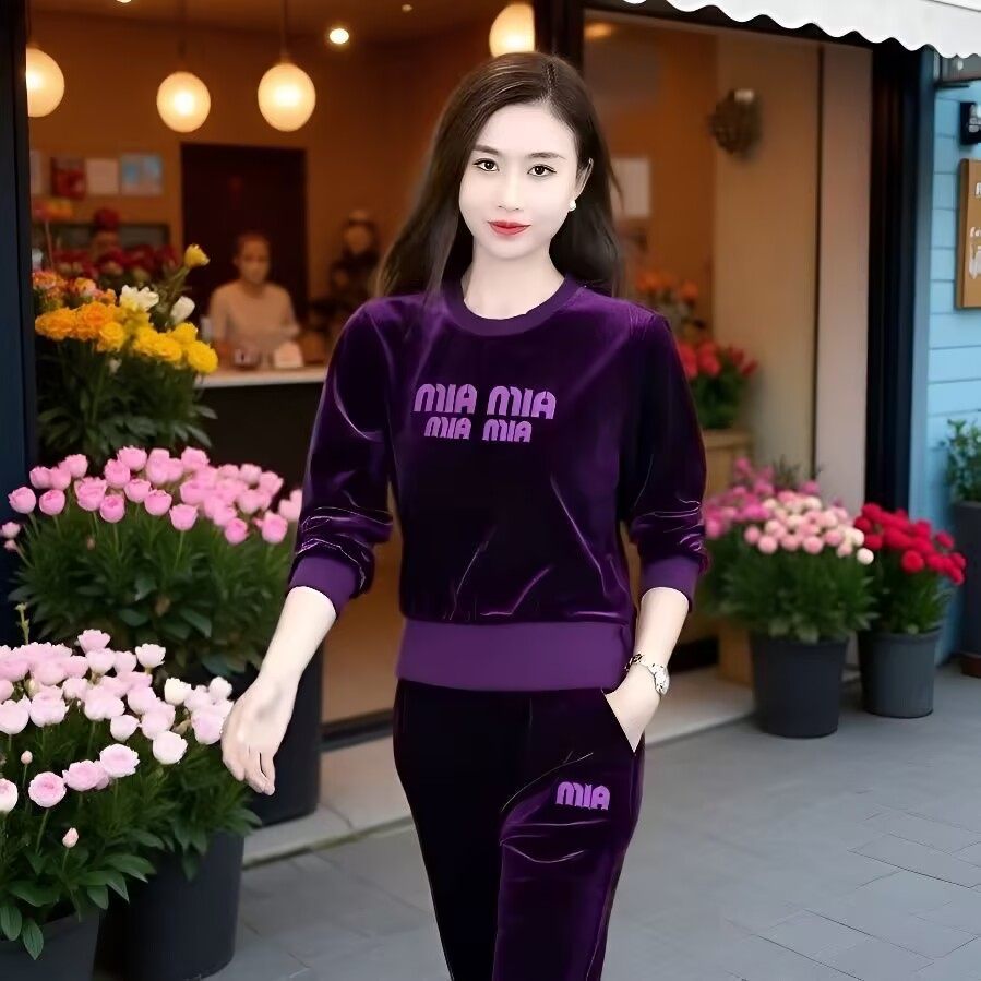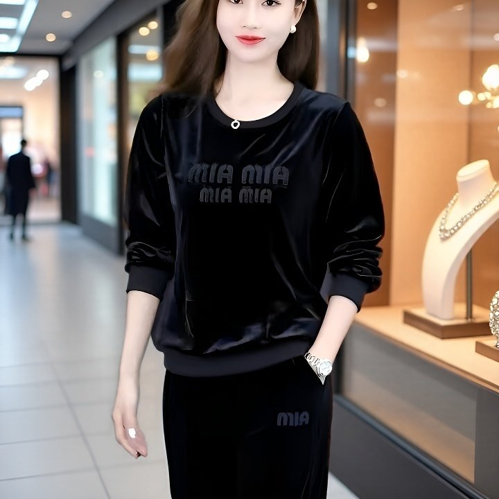 春秋季2025新款时尚宽松两件套圆领套头显瘦运动休闲金丝绒套装女