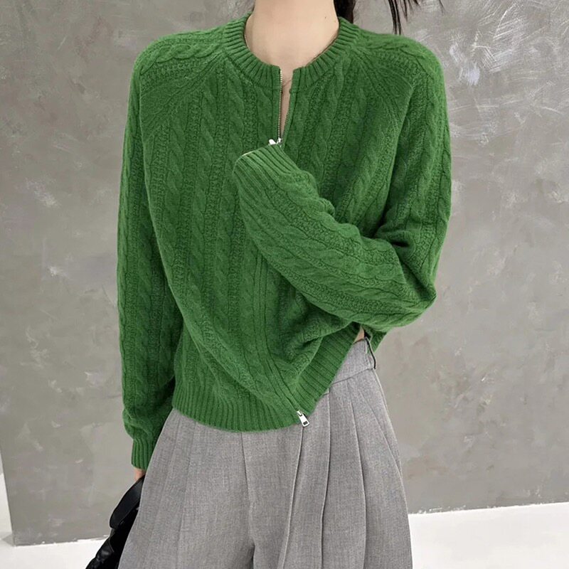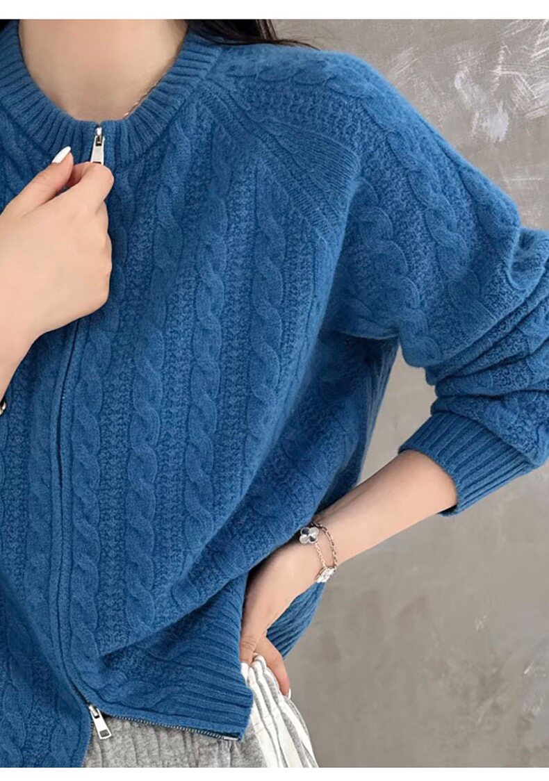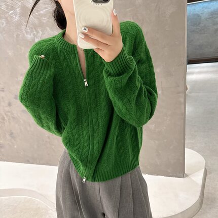 秋冬款圆领双拉链100%纯羊毛开衫女麻花慵懒宽松显瘦针织毛衣外套