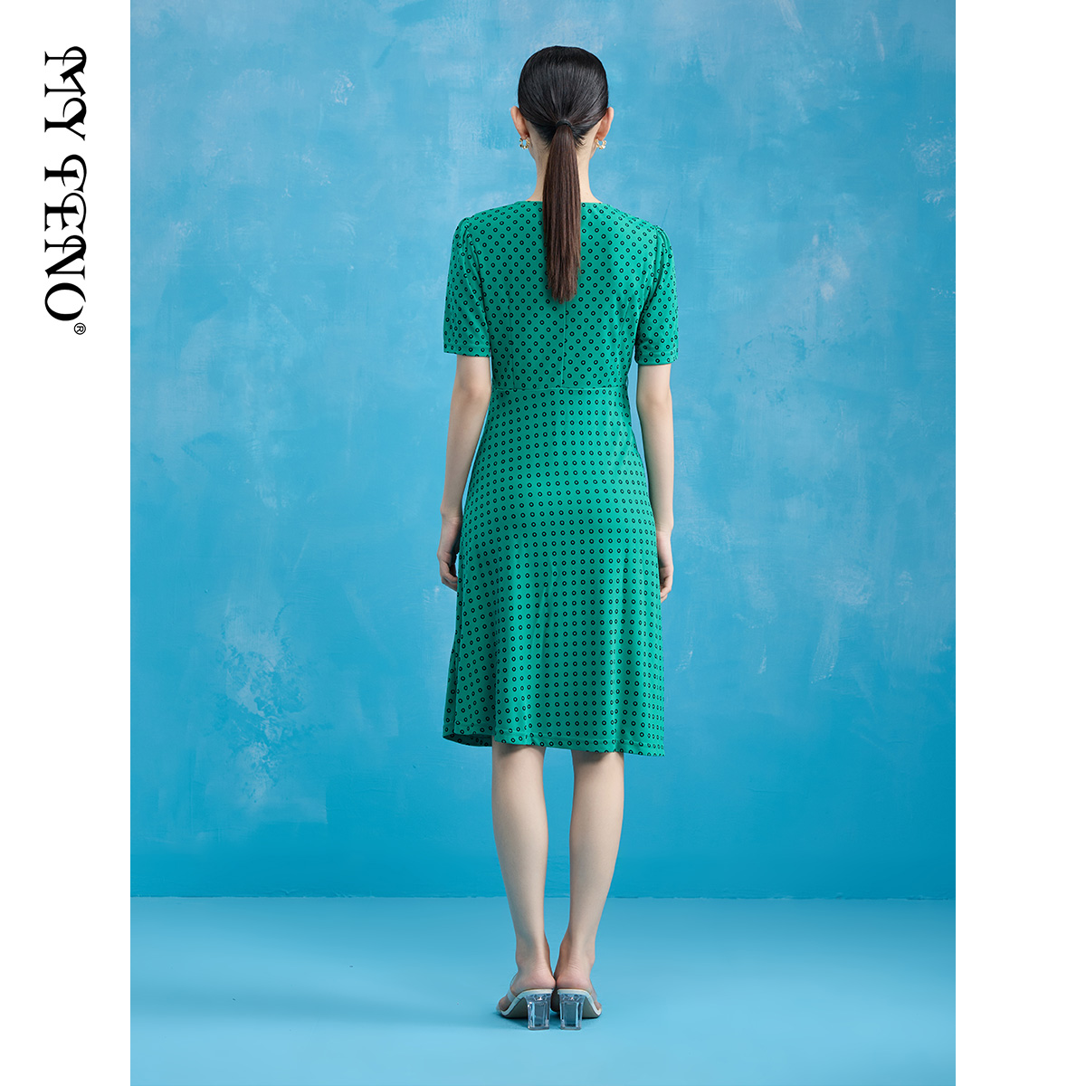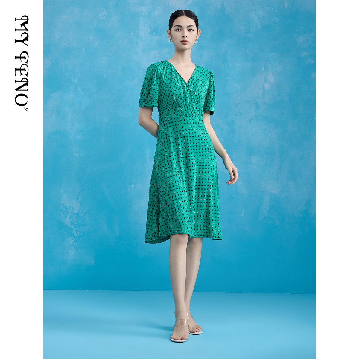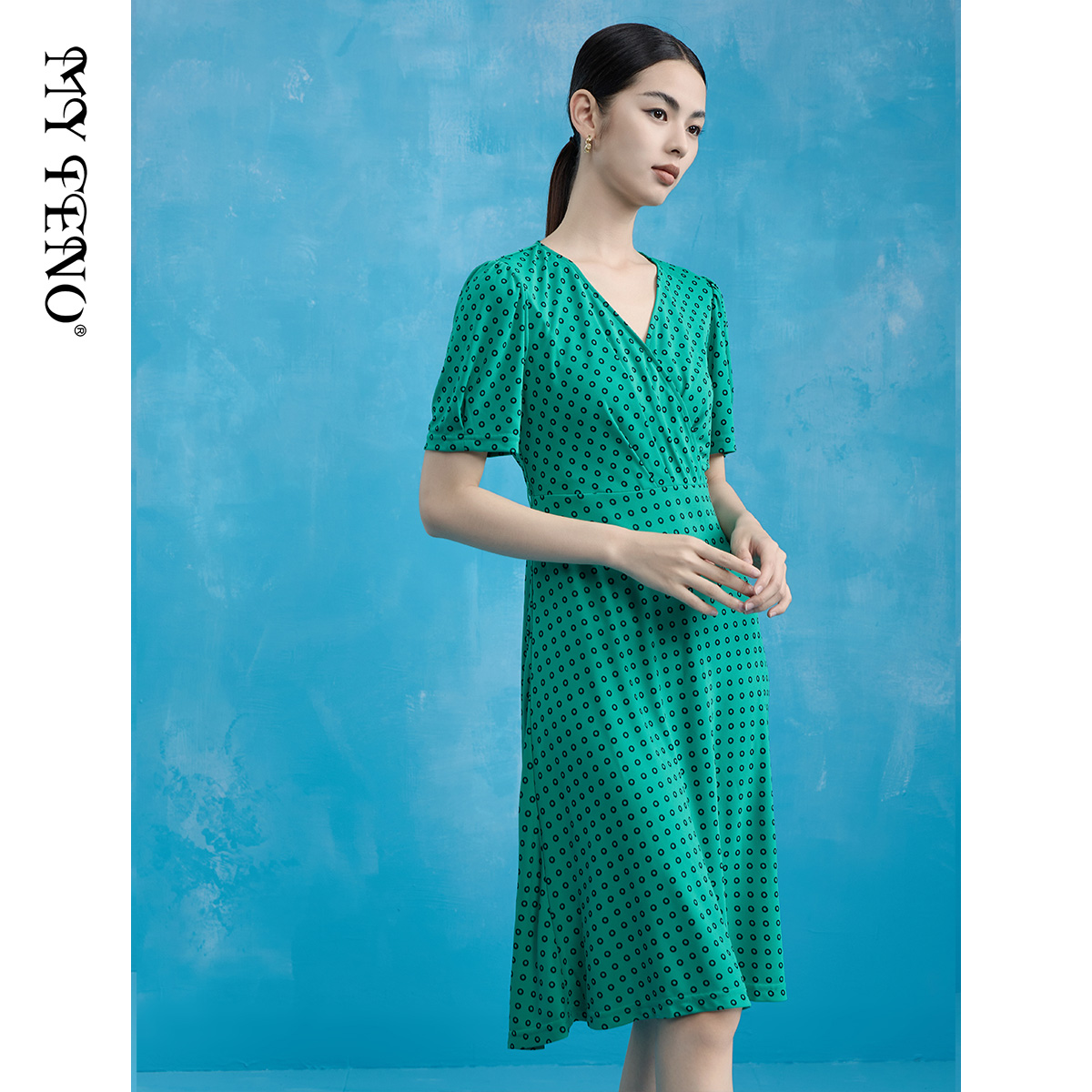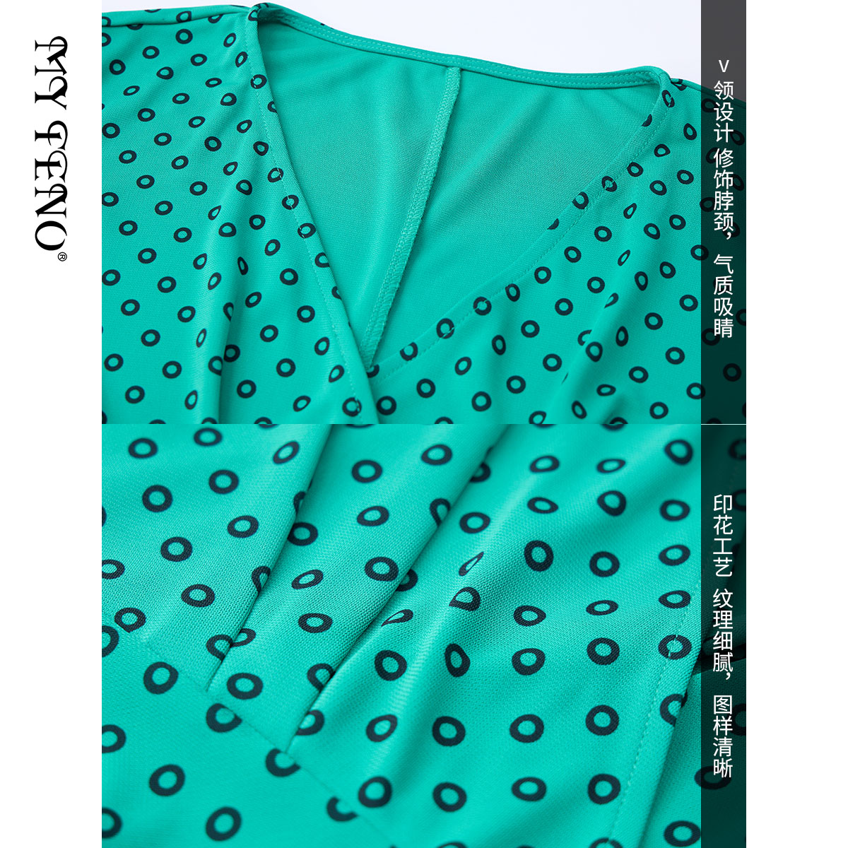 马天奴夏季新款绿色V领印花连衣裙短袖气质收腰中长裙子时尚流行