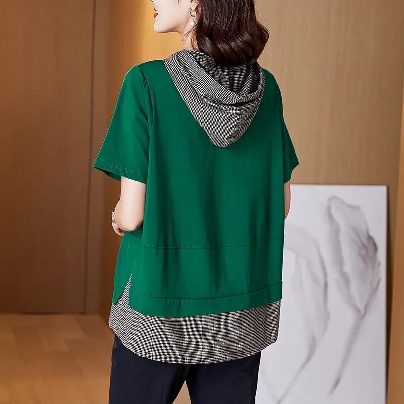 纯棉T恤夏装新款连帽假两件妈妈