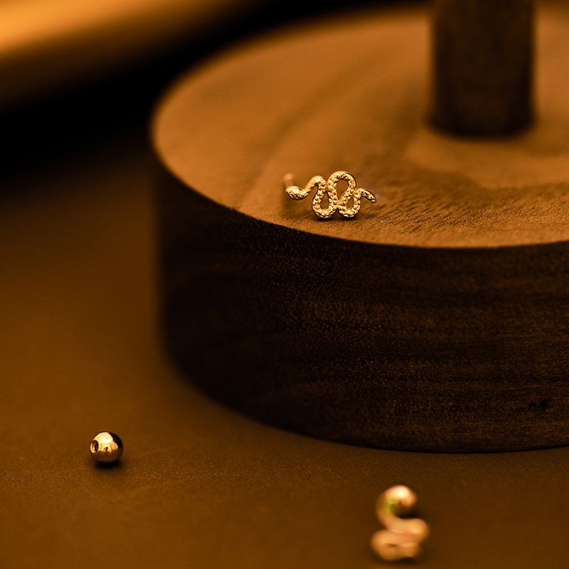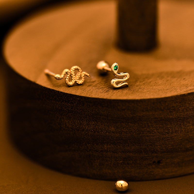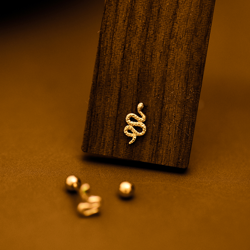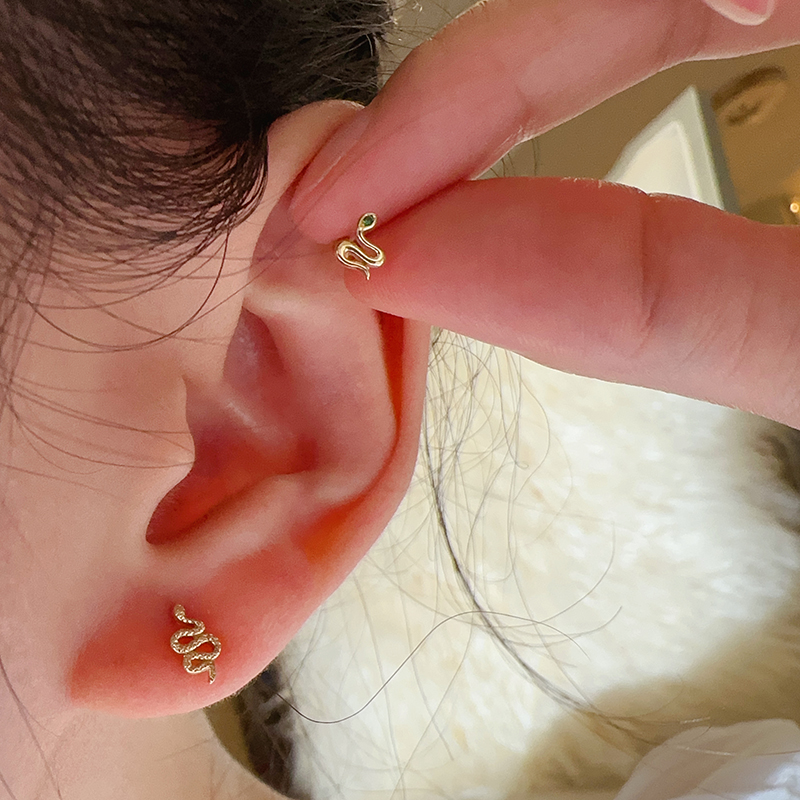 韩国时尚10K黄金耳钉女 蛇形镶钻螺纹螺丝耳饰通体K金养耳洞单只