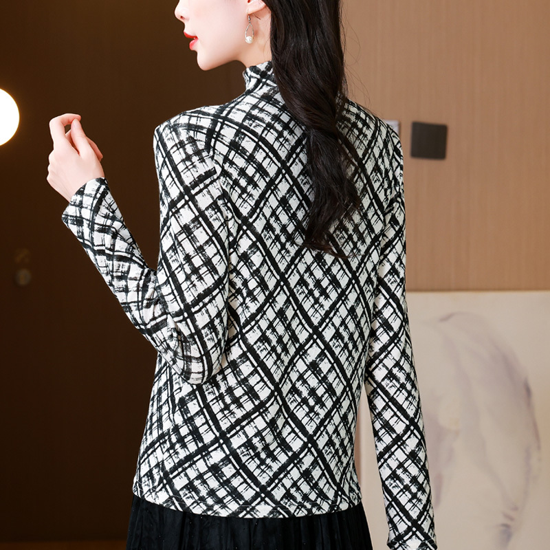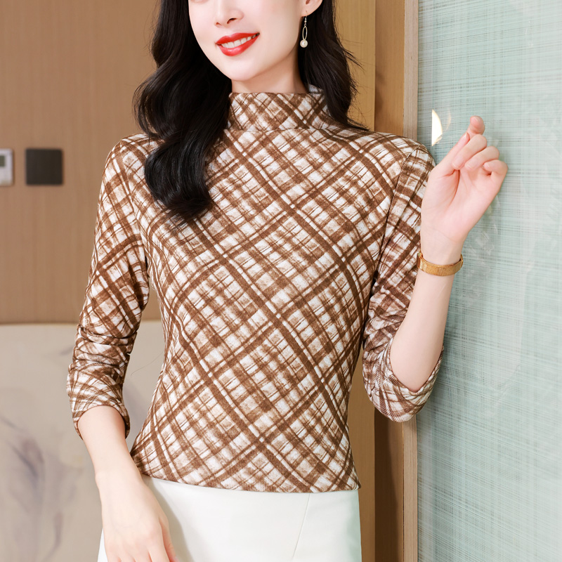 时尚格子印花长袖T恤女士内搭秋冬新款半高领网纱打底衫洋气上衣
