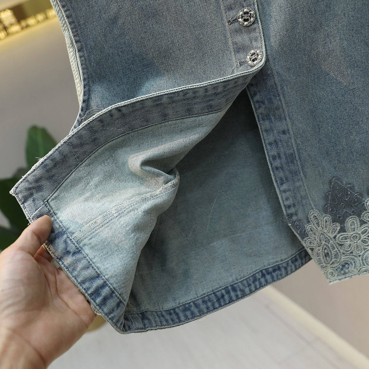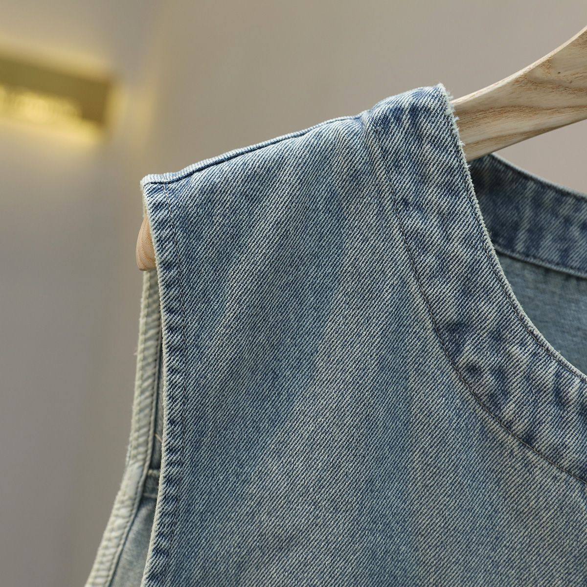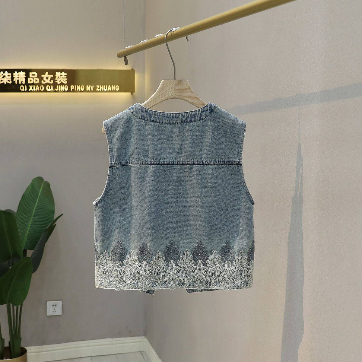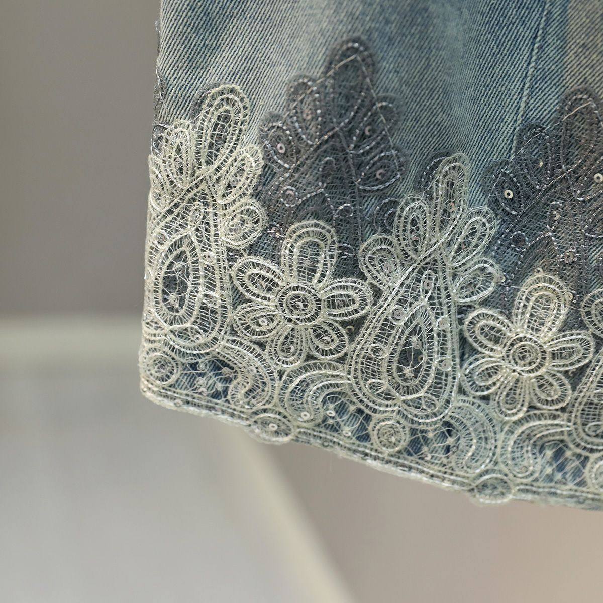 法式小香风蕾丝钩花亮片下摆牛仔马甲女2025春款圆领无袖坎肩外套