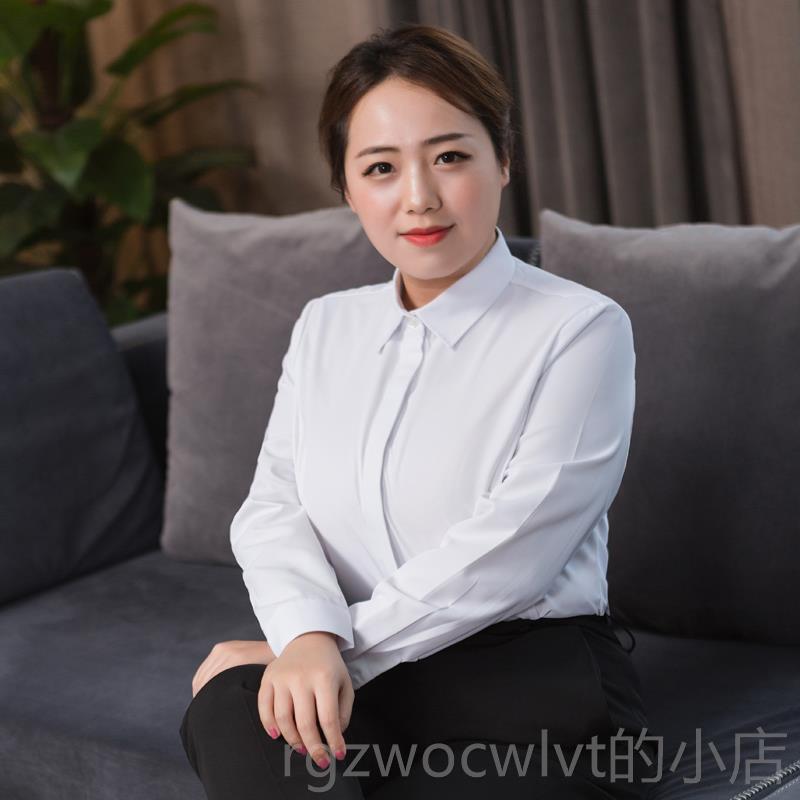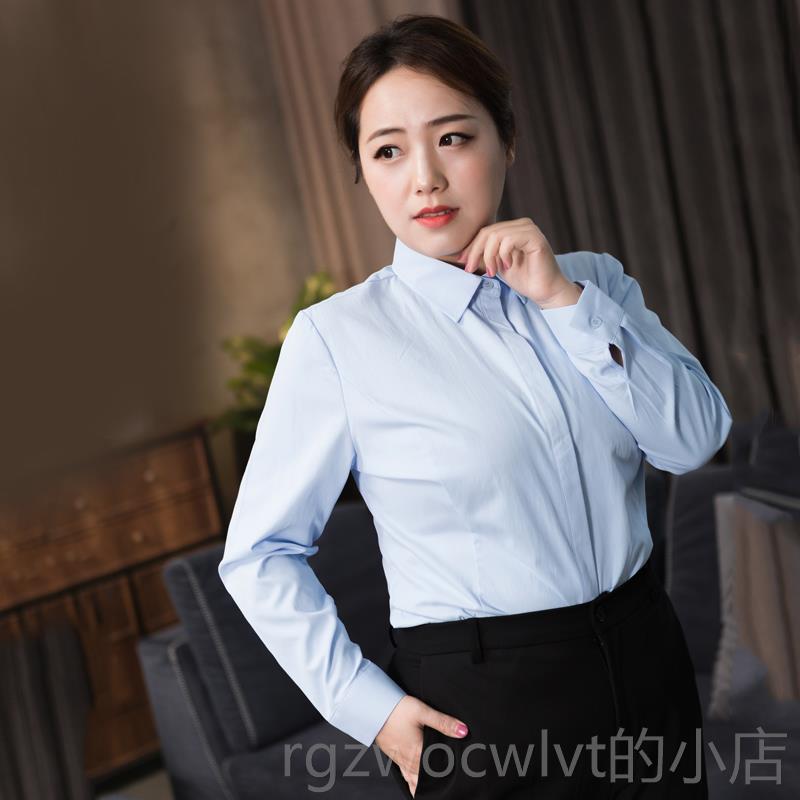 新款加大码工服白衬衫女长袖职业正0装宽松20作斤胖mm蓝色短袖衬