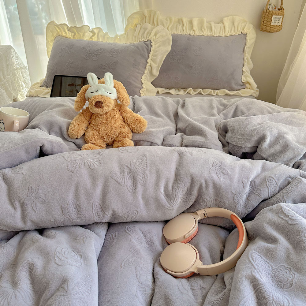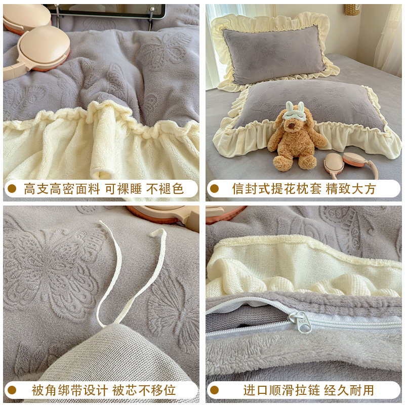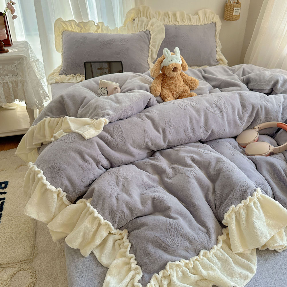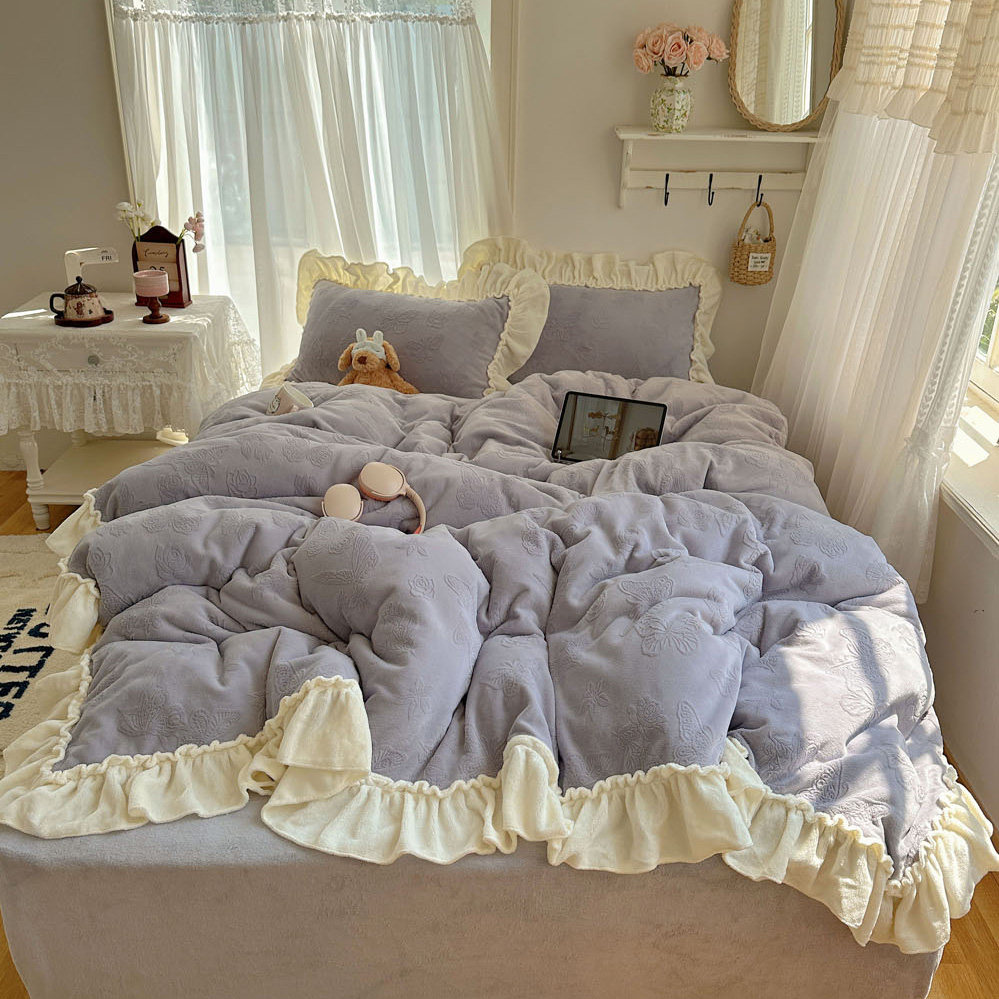 秋冬季公主风花边牛奶绒床上四件套床品双面绒被套加绒珊瑚绒床单