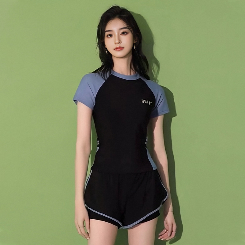运动款泳衣女分体套装短袖大码胖mm遮肉显瘦保守平角裤韩国泡温泉