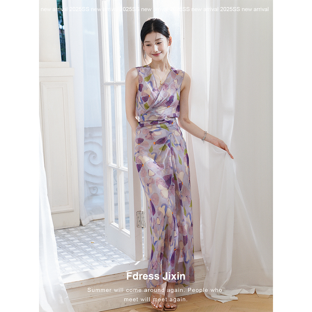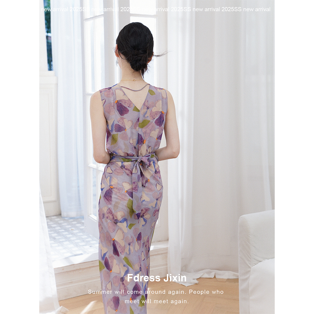 Fdress寄信/艺术感紫色印花斜裁优雅无袖背心裙交叉系带V领连衣裙