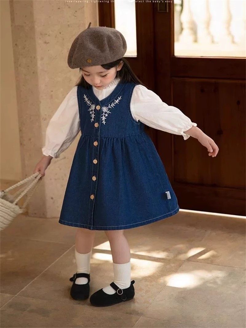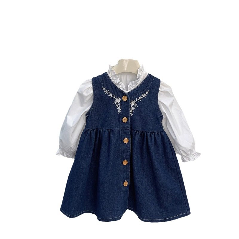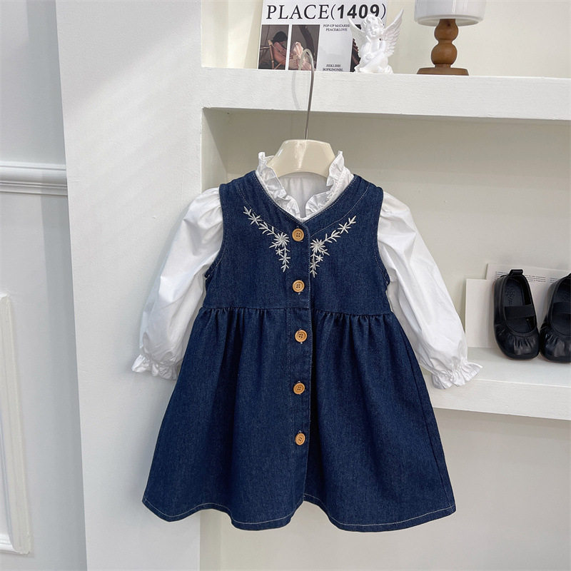 女童绣花牛仔裙套装2024秋季新款韩版小女孩背心裙花边衬衫两件套