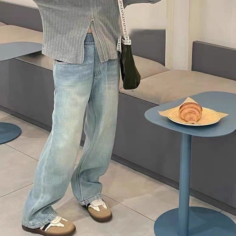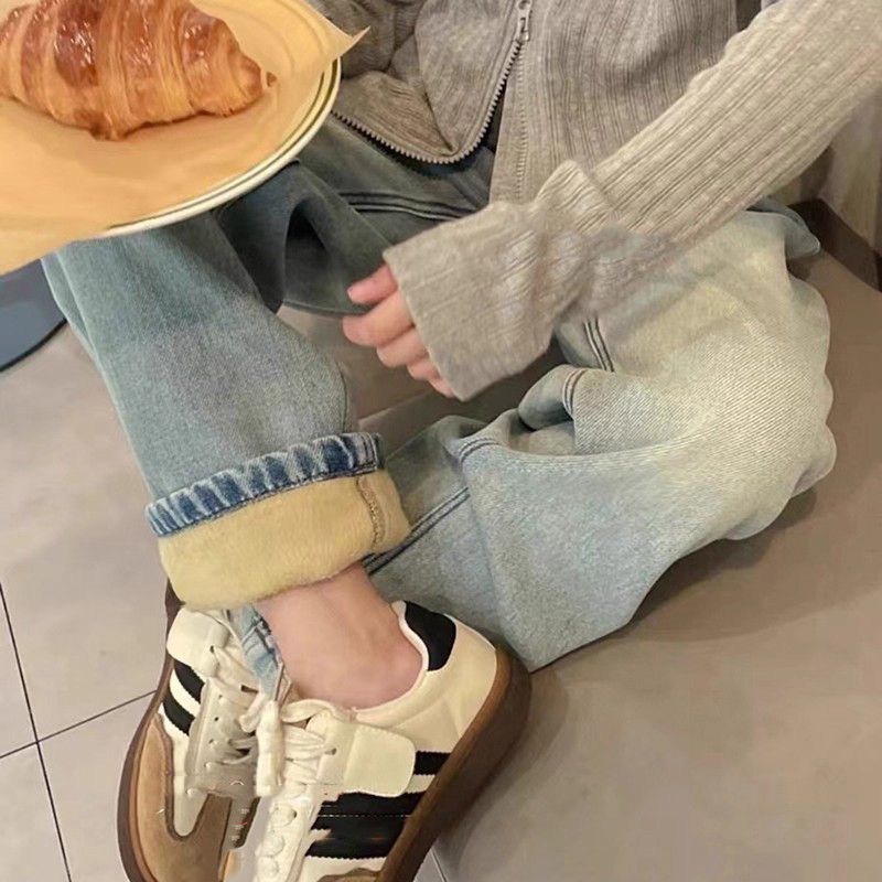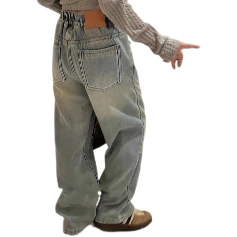 女孩春秋冬季休闲裤女童韩版宽松一体绒牛仔裤儿童洋气加厚阔腿裤