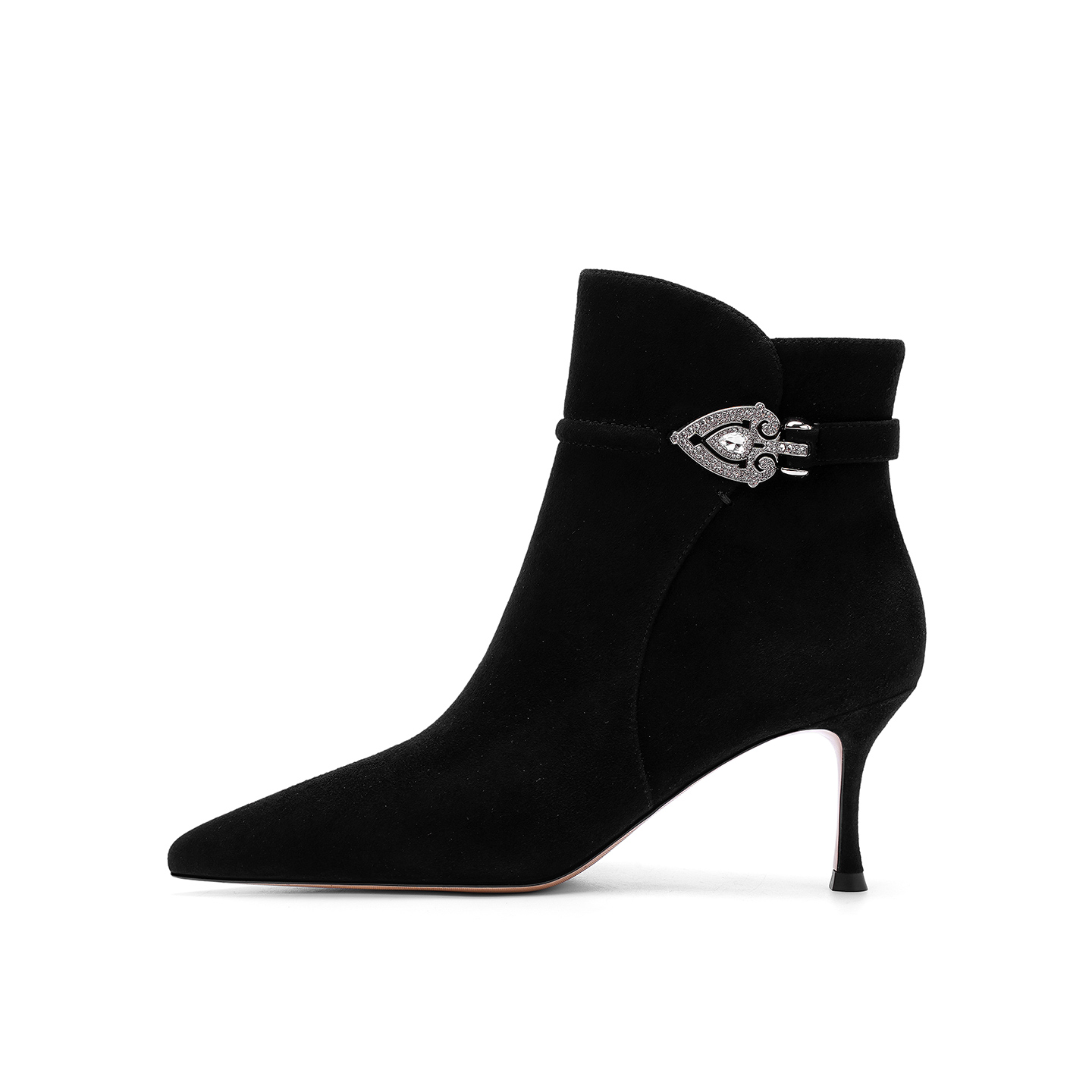 诺贝达新款羊反绒时装靴中筒细跟尖头短靴冬季保暖女靴RA244308
