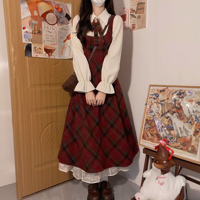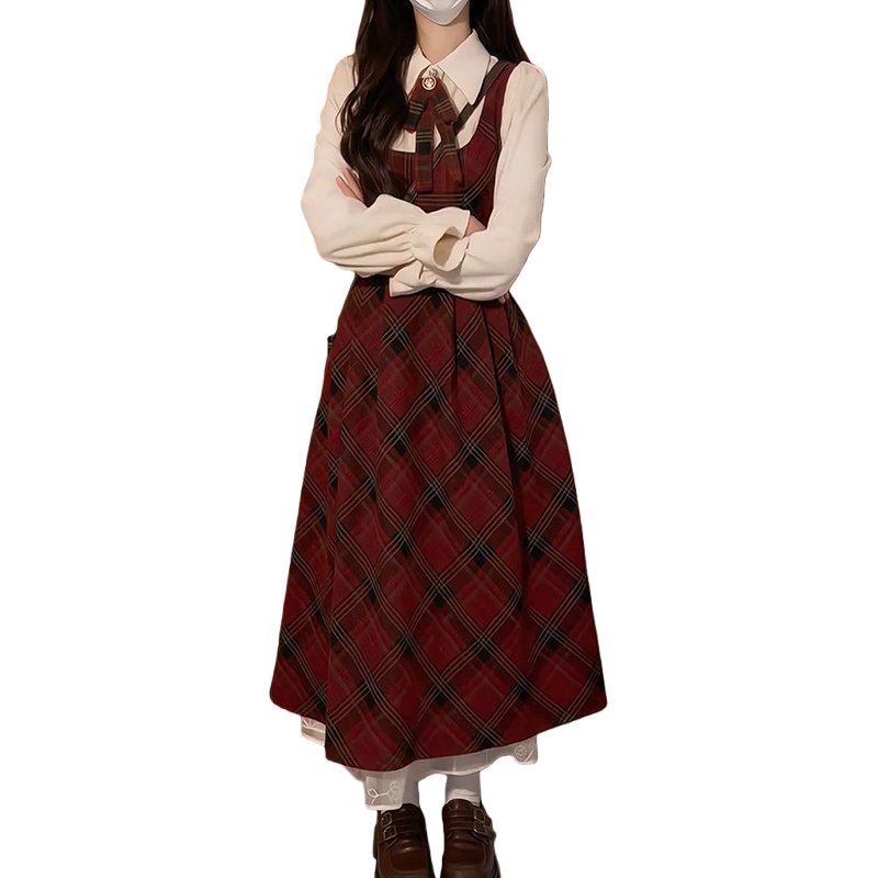 法式学院风气质圣诞红格毛呢背带连衣裙杏色长袖衬衫带领结两件套
