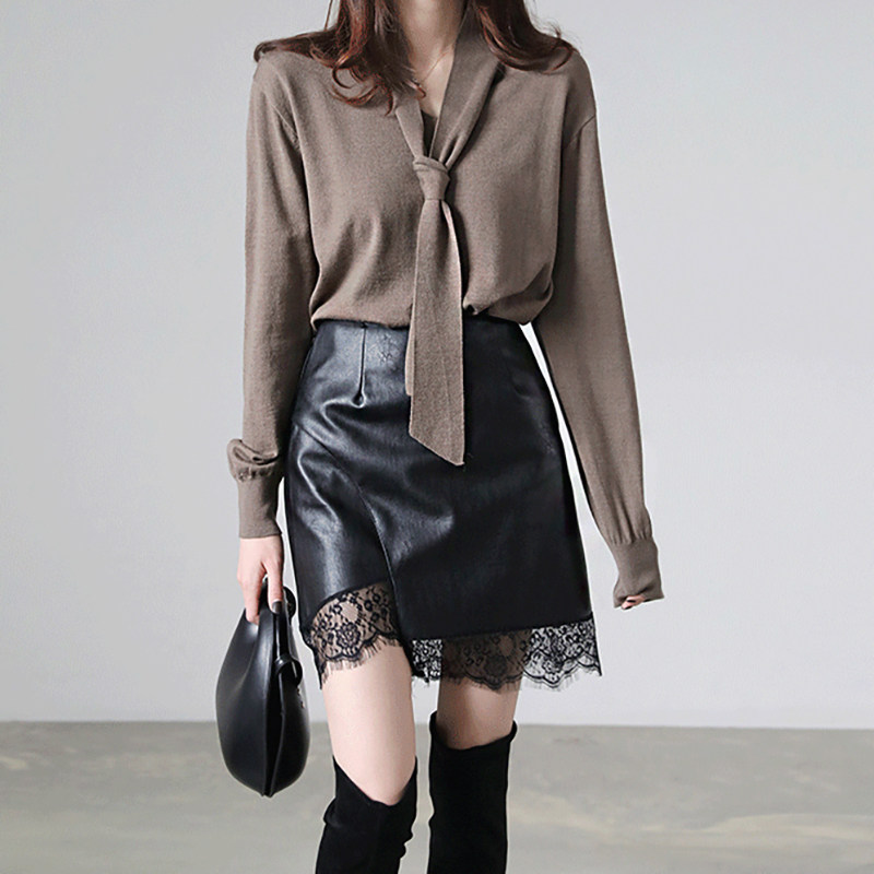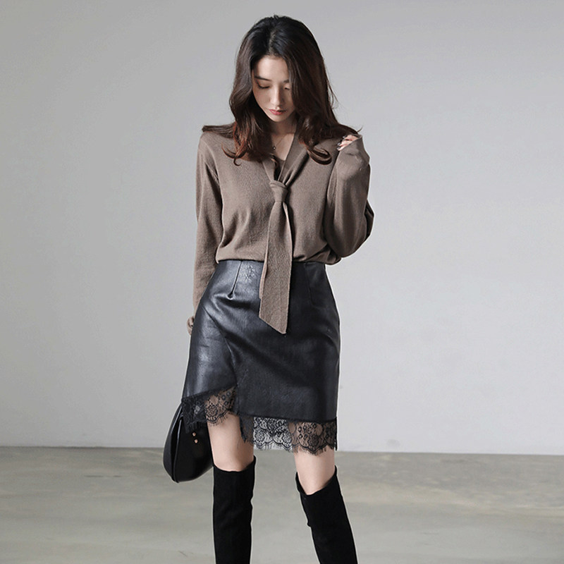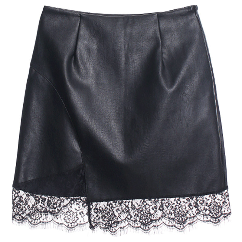 pu皮拼接蕾丝2025新款黑色a字包臀皮裙半身裙高腰显瘦短裙女 秋冬