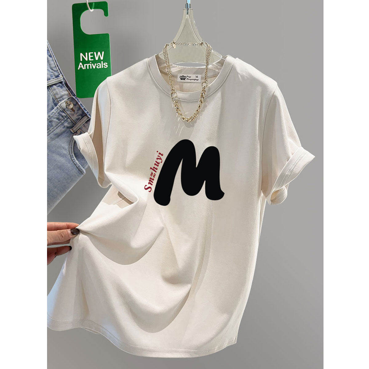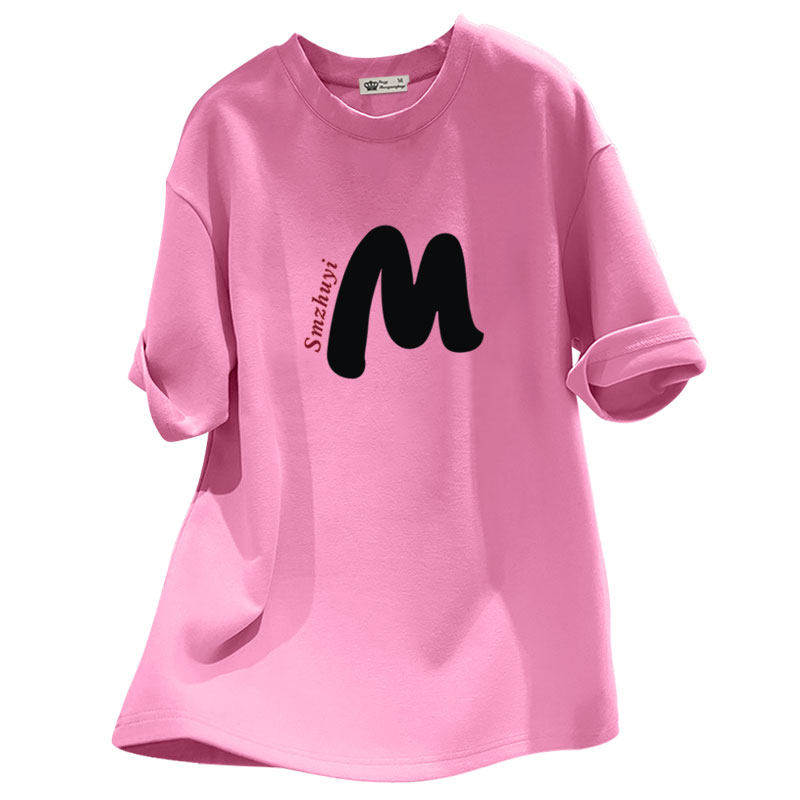 粉色短袖t恤女2026新款夏季M字母休闲大版宽松纯棉上衣中长款潮牌