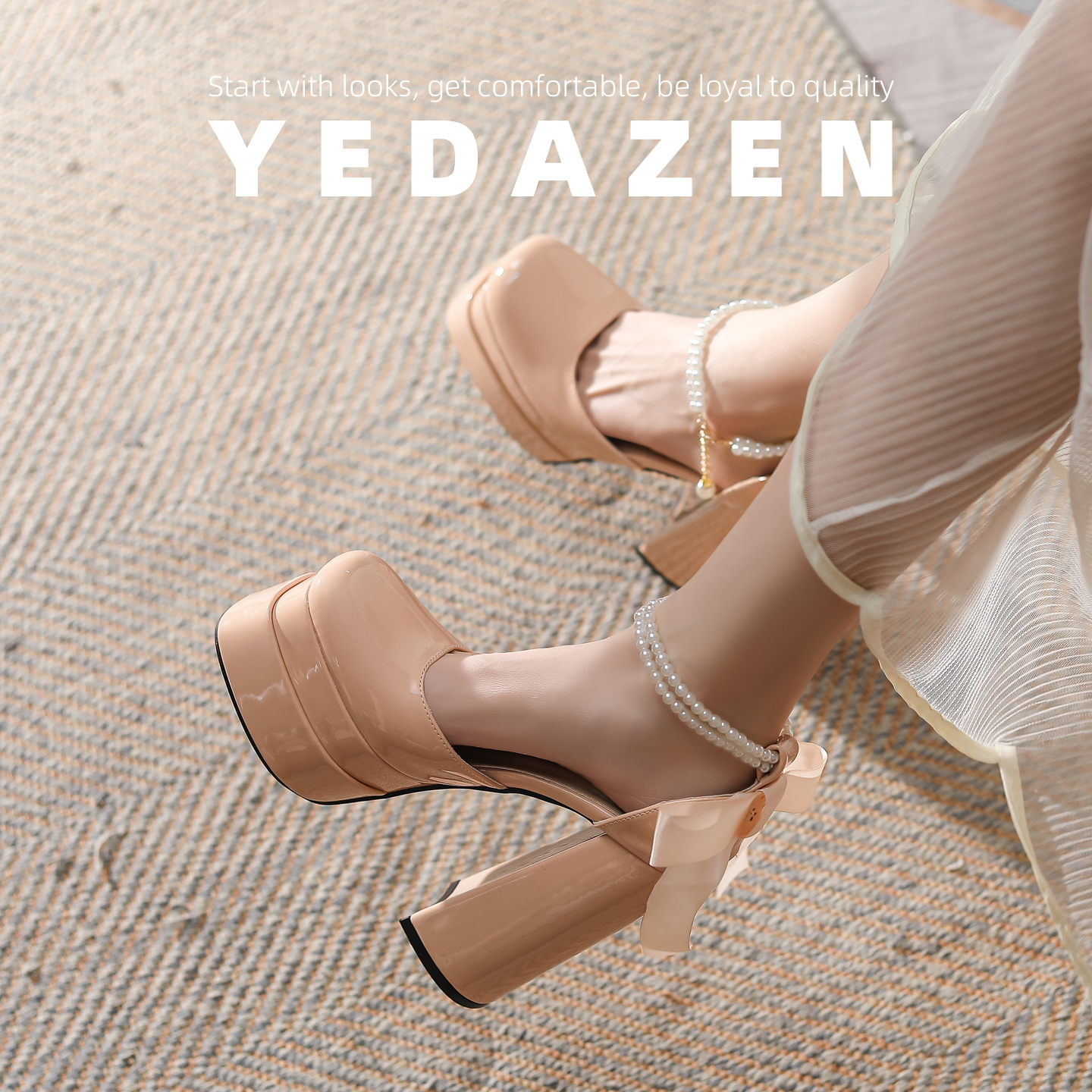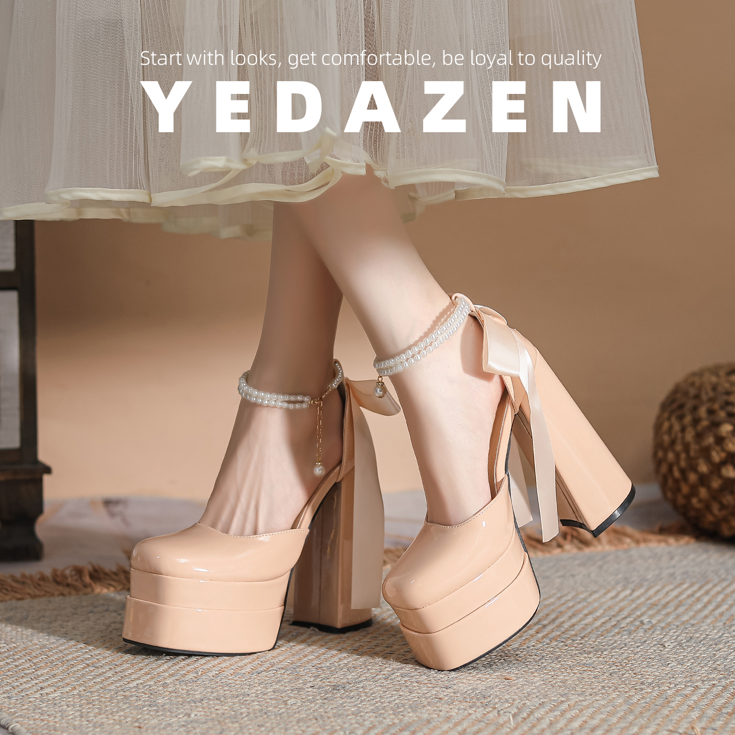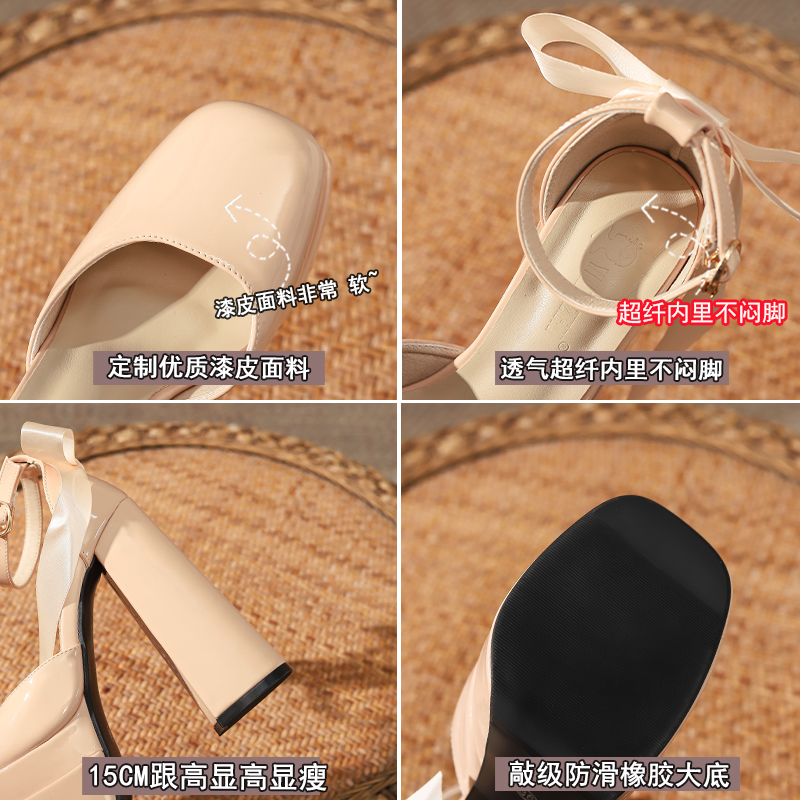 15CM防水台绝美裸色高跟鞋女粗跟小个子厚底一字带珍珠单鞋配裙子