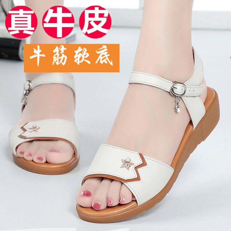 真皮妈妈鞋女凉鞋2024夏季新款平底中粗跟中老年舒适软底大码女鞋