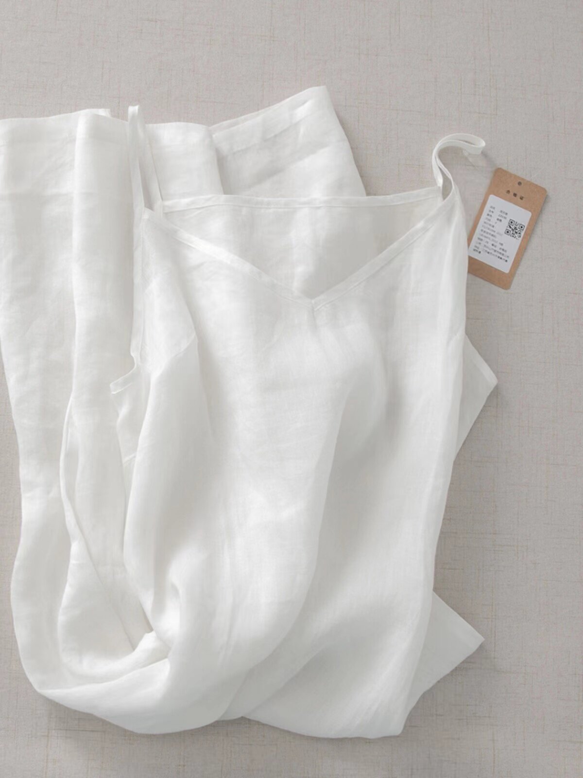 清仓捡漏~白色苎麻v领吊带连衣裙女夏季棉亚麻内搭衬裙打底中长裙