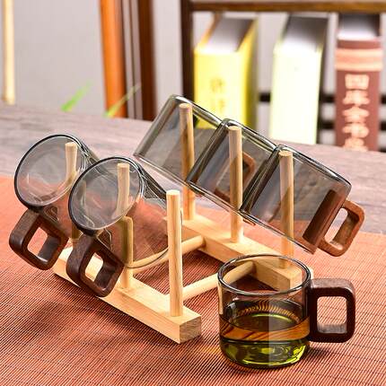 玻璃小茶杯高硼硅加厚耐高温简约品茗杯防烫带把胡桃木手柄待客杯