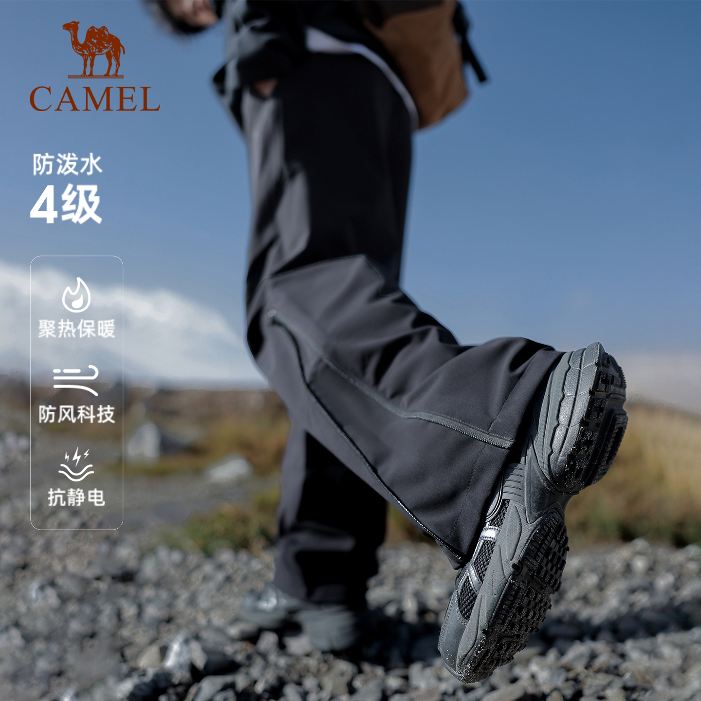 骆驼户外滑雪休闲裤男秋冬加绒保暖冲锋宽松直筒徒步登山软壳裤女