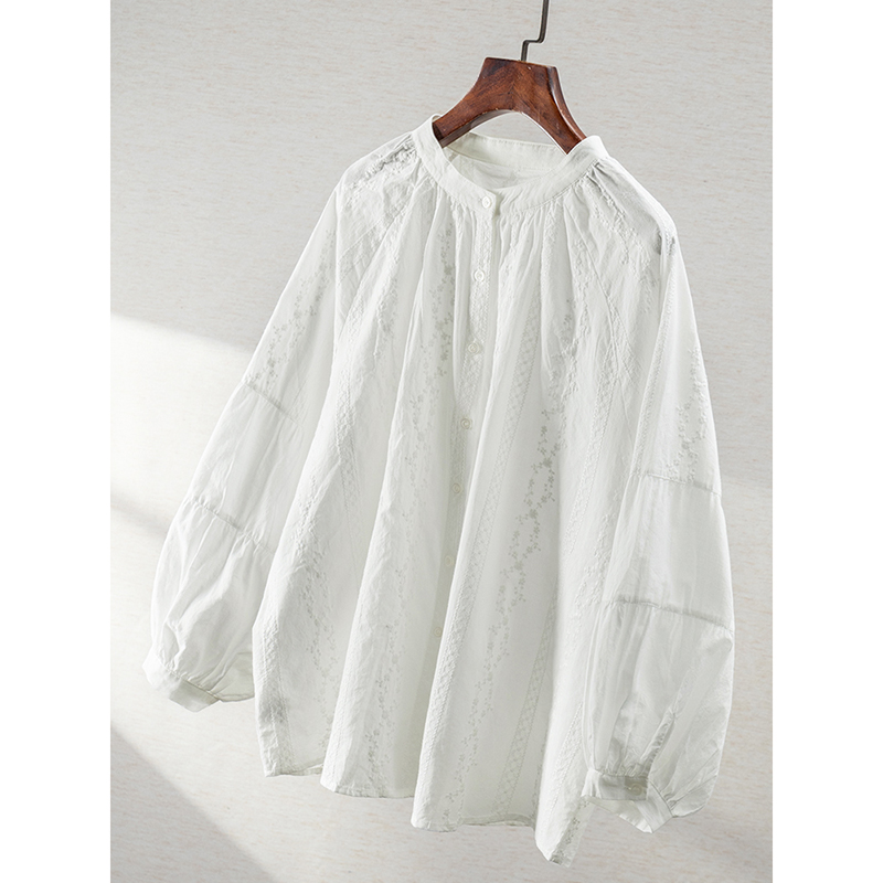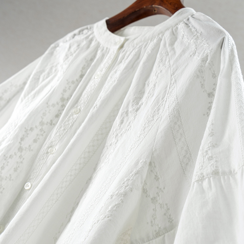 法G万针绣100棉圆领灯笼袖衬衫