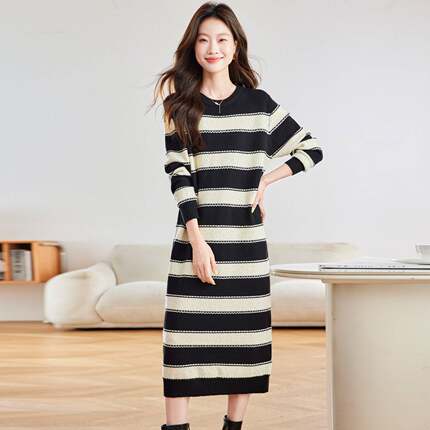 法式复古条纹针织打底连衣裙女春秋宽松中长款过膝慵懒风毛衣裙子