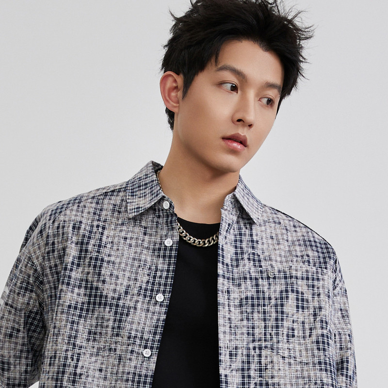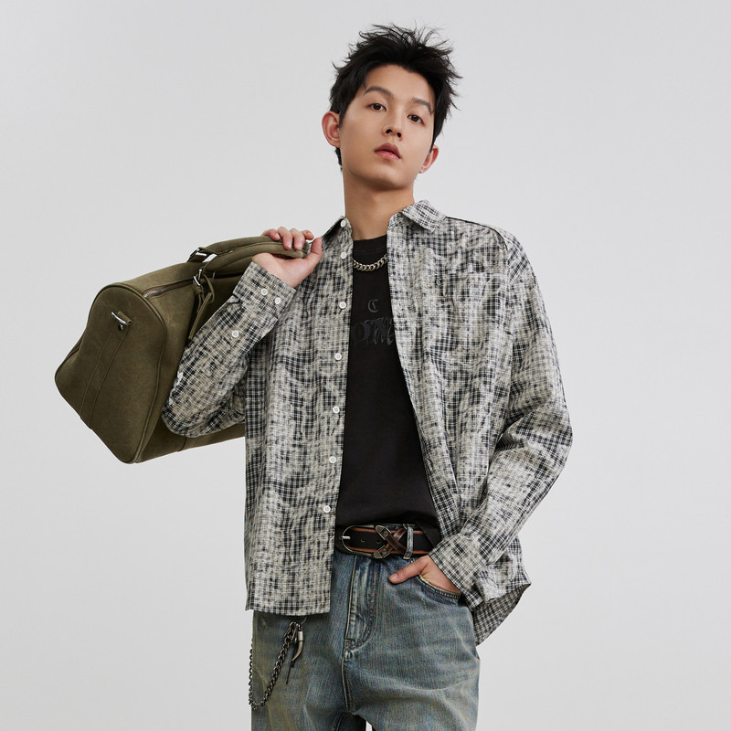 【仿扎染格子】卡宾印花休闲衬衫男装2026春季新款格纹长袖开衫
