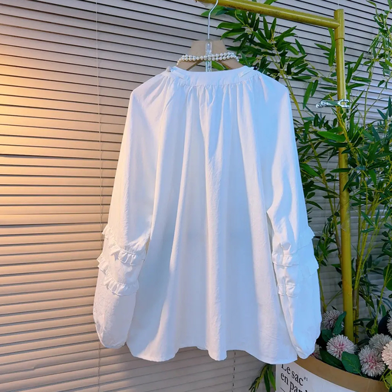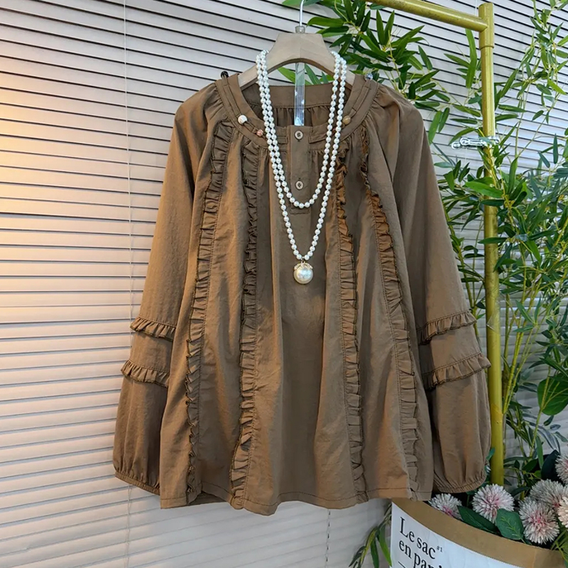 大码女装圆领荷叶边长袖小衫2205秋季款宽松遮肚子胖MM学院风上衣