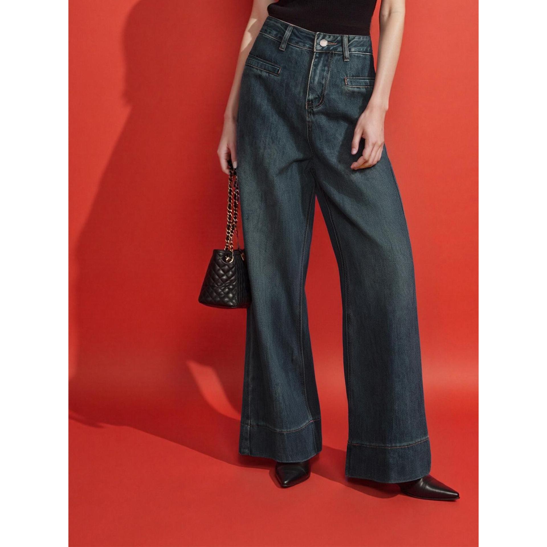 Basic House/百家好覆古普鲁士蓝高腰阔腿裤女2025秋冬宽松直筒裤