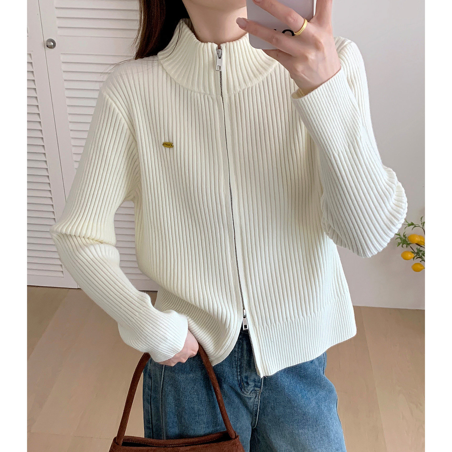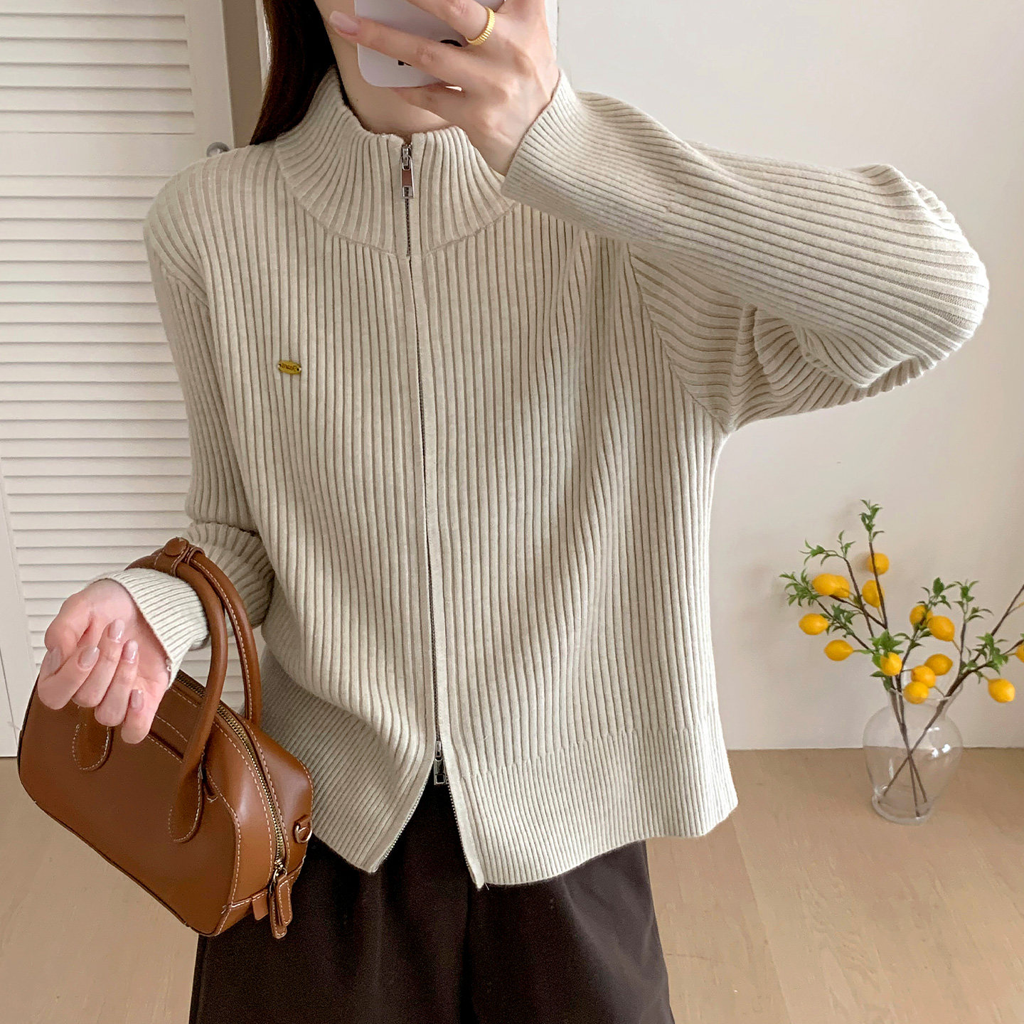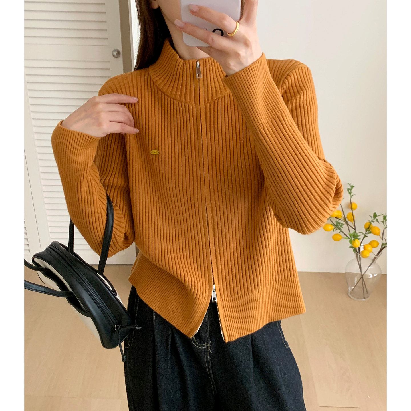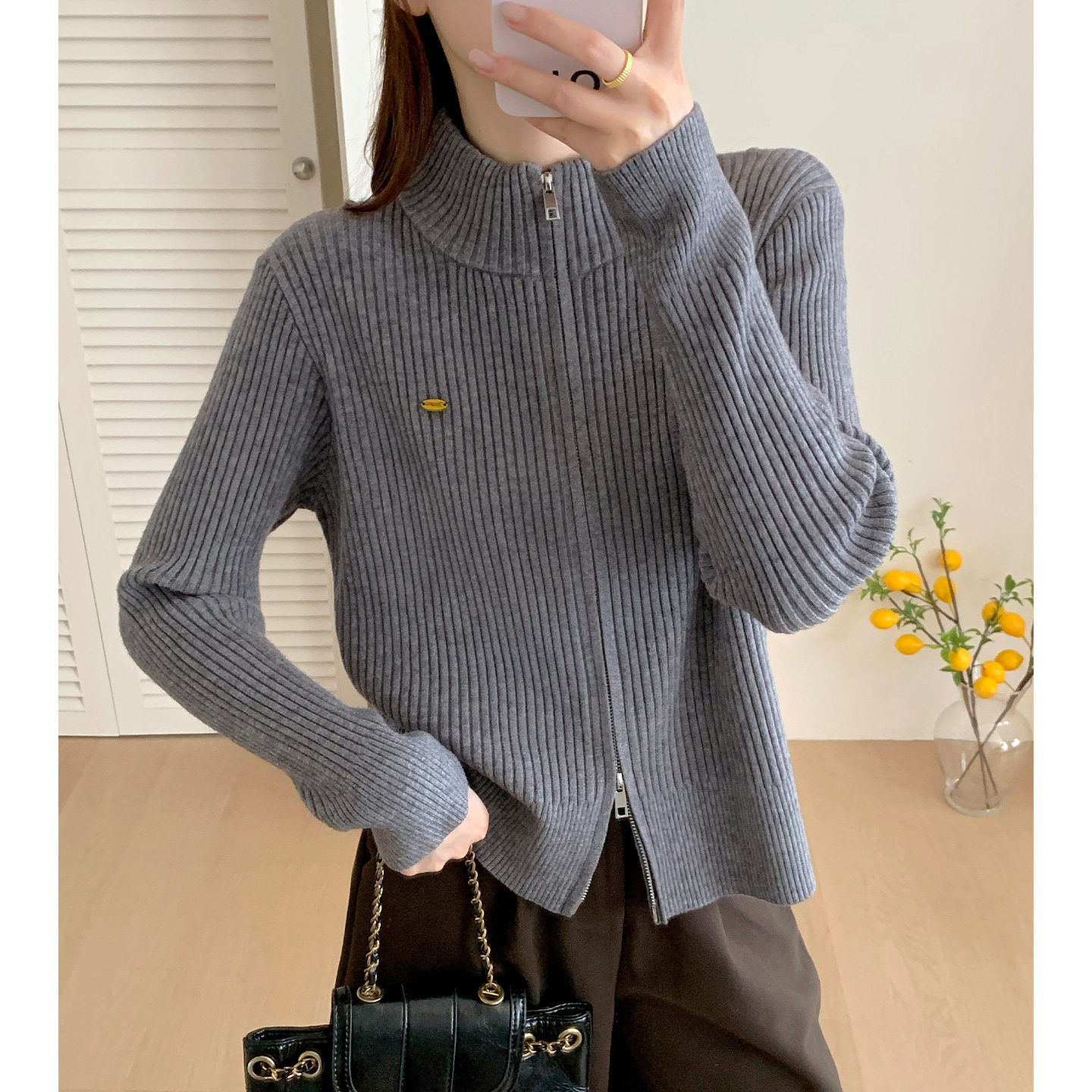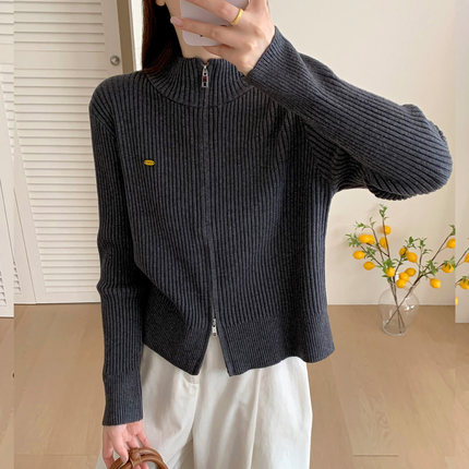 双拉链针织开衫女2026秋季韩版新款纯色百搭毛衣外套宽松上衣