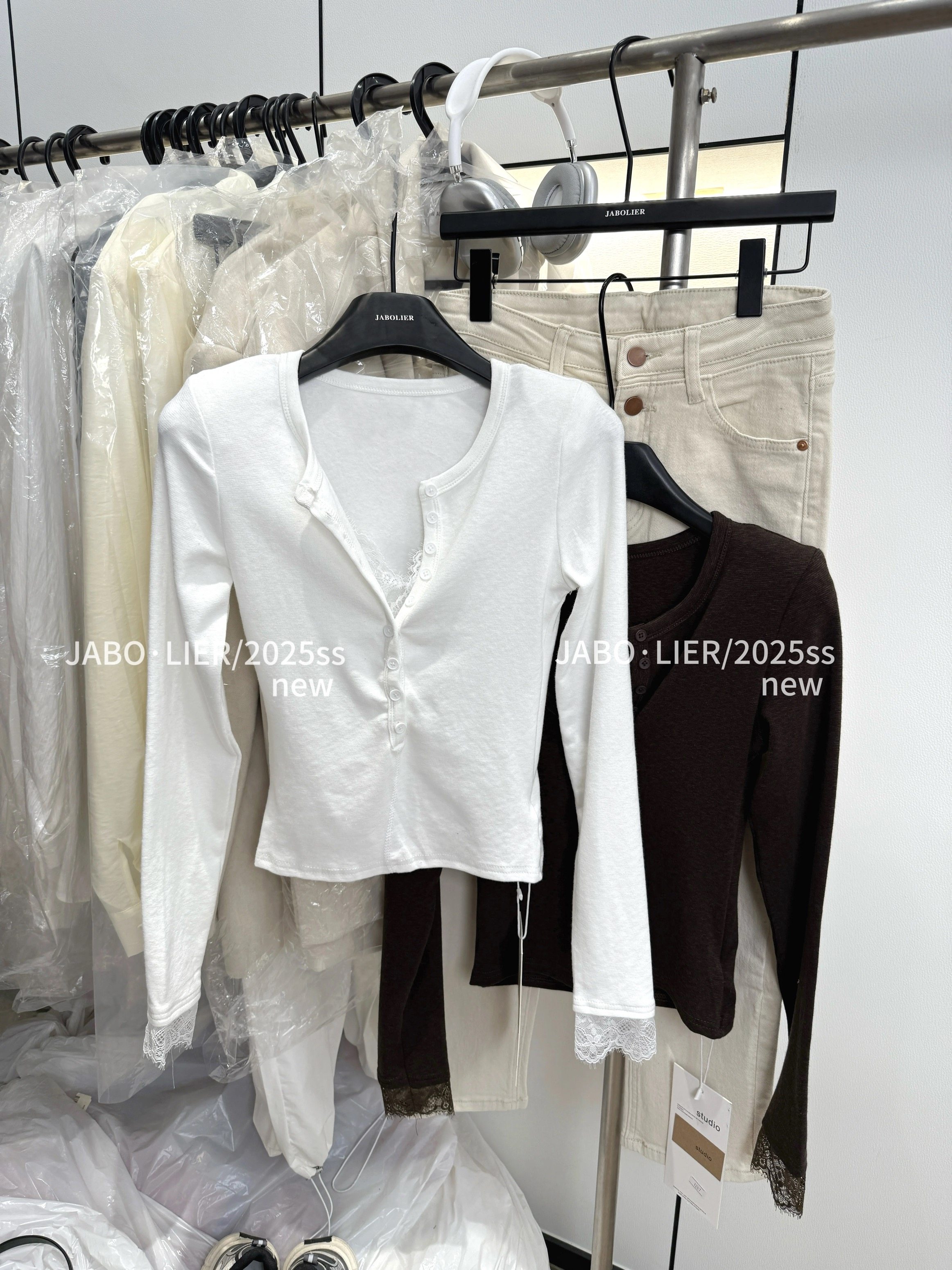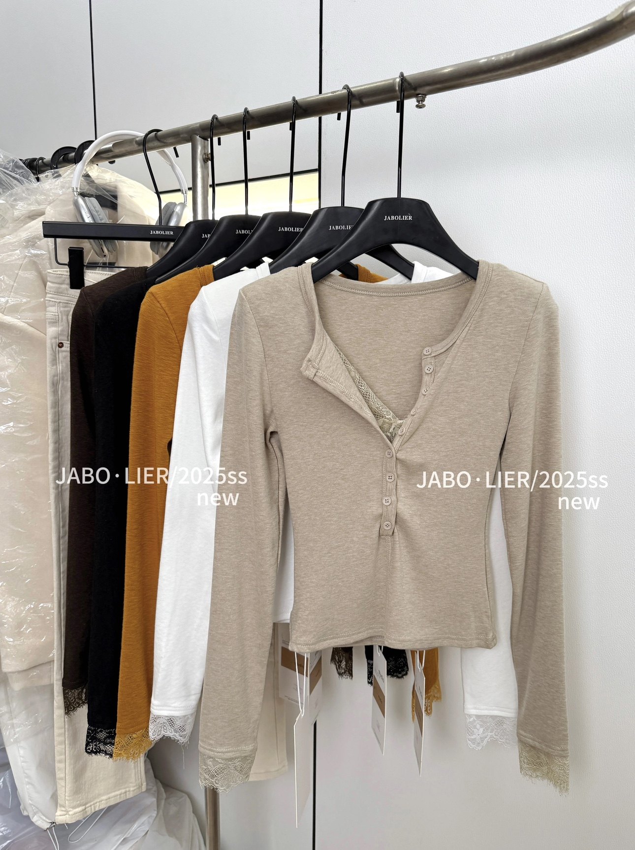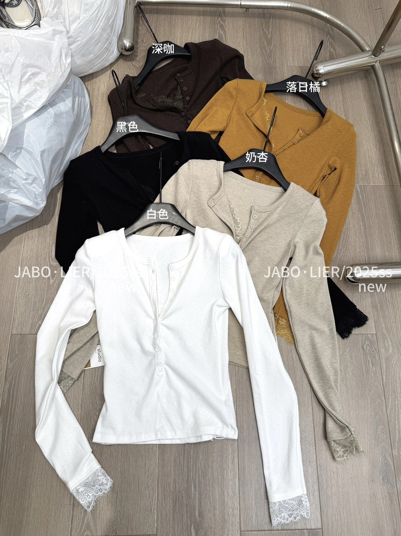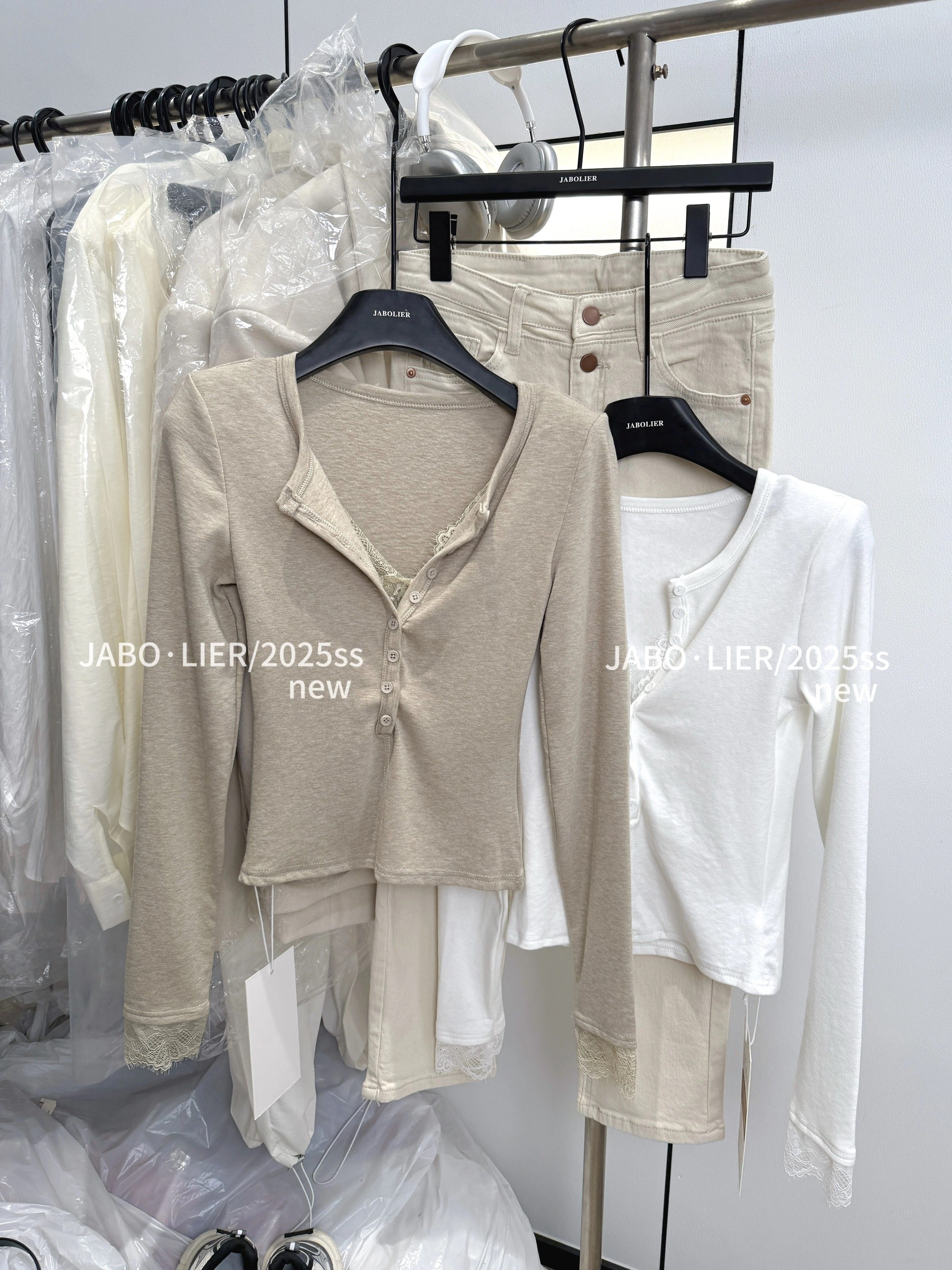 十三行2025秋冬新款磨毛绒韩版修身显瘦V领蕾丝拼接长袖T恤上衣女