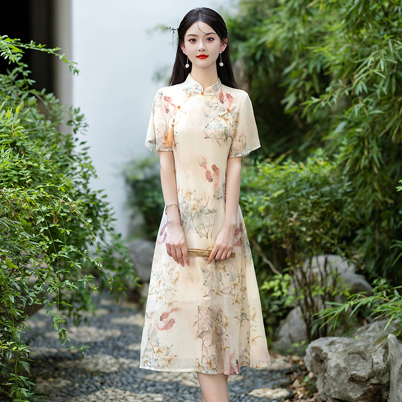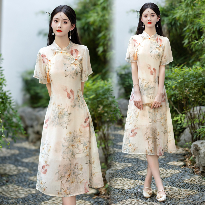 【外贸处理】新中式复古印花设计改良旗袍日常可穿立领盘扣连衣裙