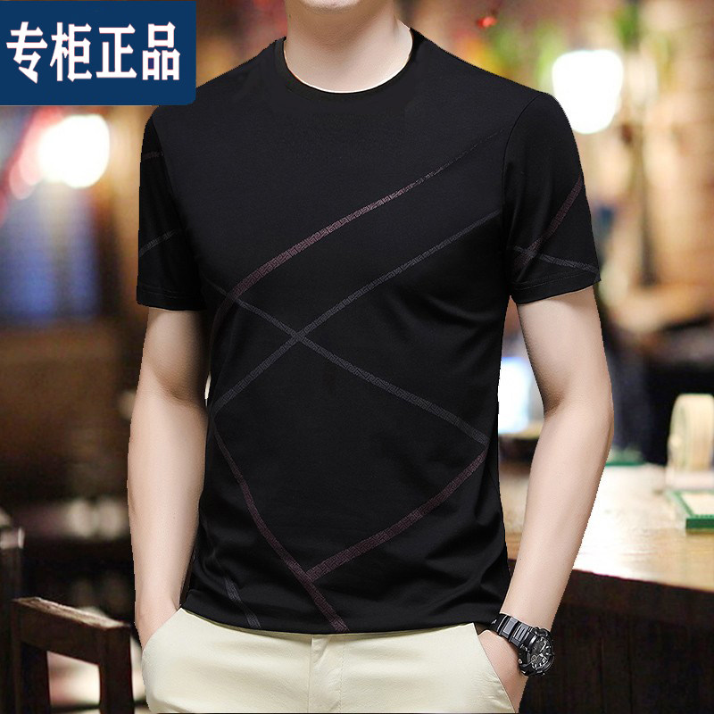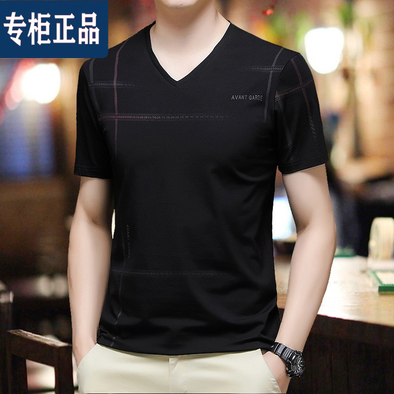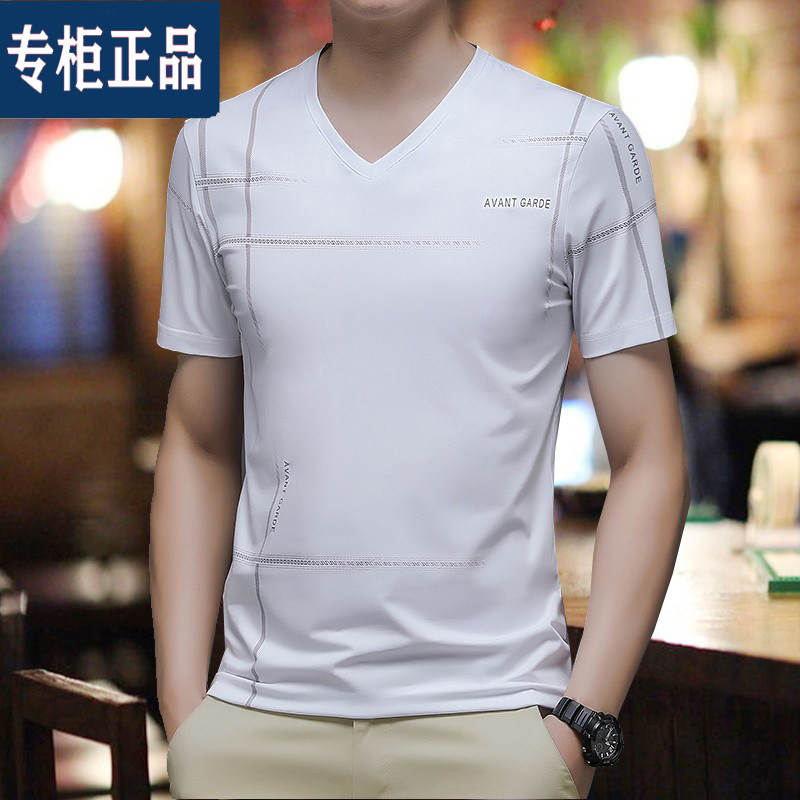 夏季冰丝光棉V领短袖t恤男装中年鸡心领宽松大码半袖爸爸装体恤衫