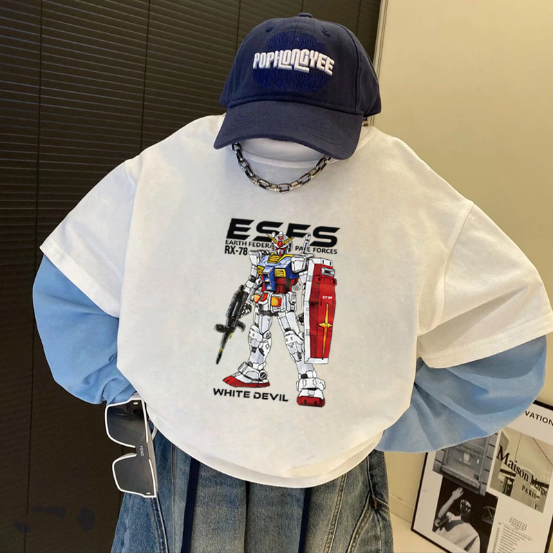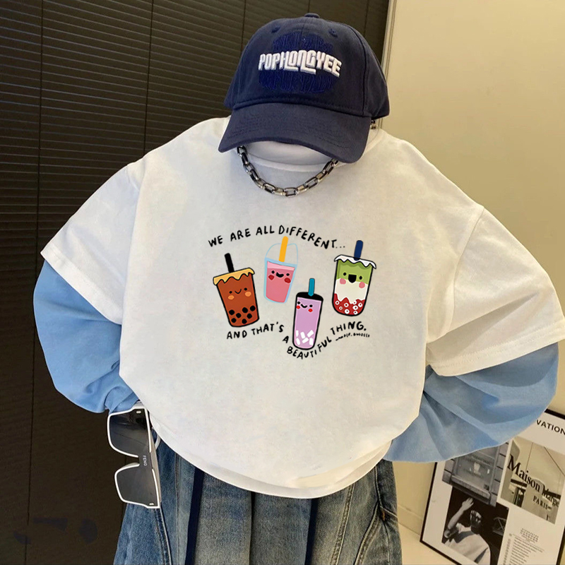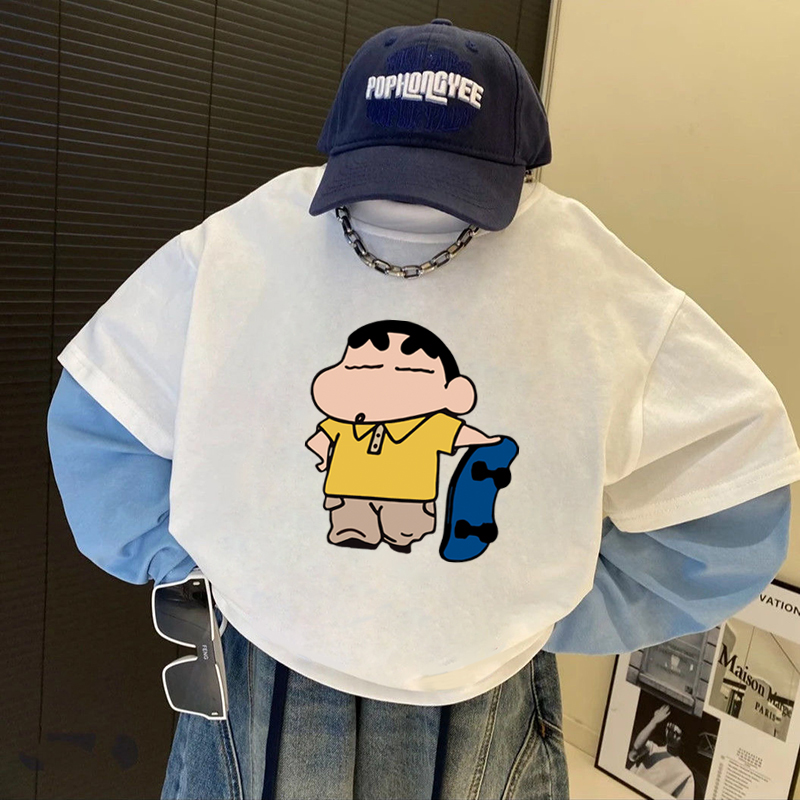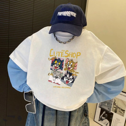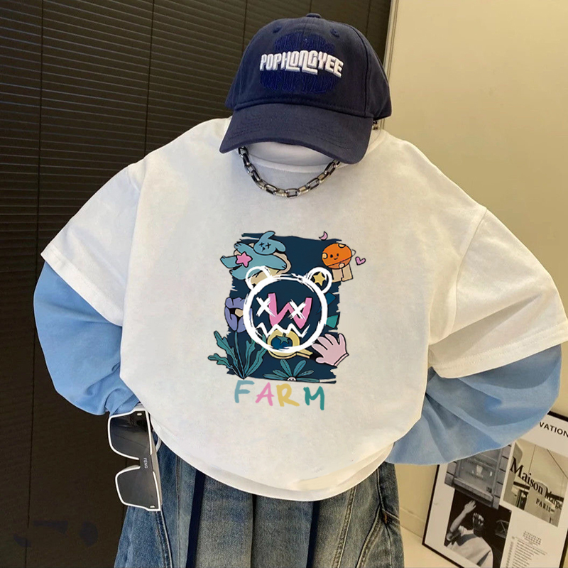 100%纯棉男童拼接圆领长袖T恤春秋新款儿童宝宝洋气印花动漫上衣