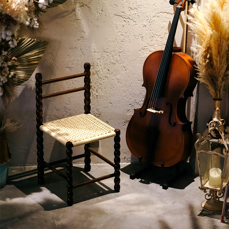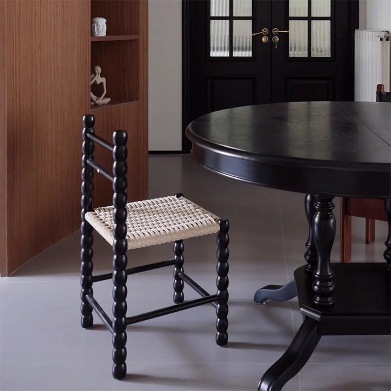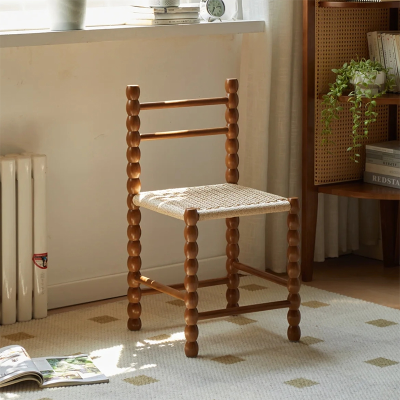 北欧绳编凳子中古设计师实木餐椅侘寂法式靠背椅复古葫芦凳小椅子