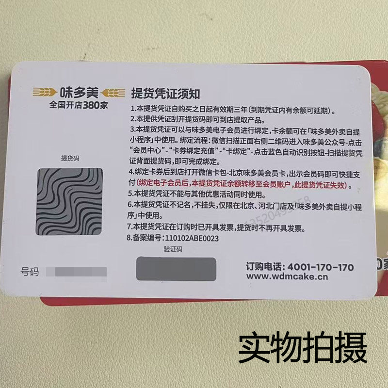 北京味多美储值卡200元 蛋糕卡 面值卡 现金卡提货卡代金卡面包卡