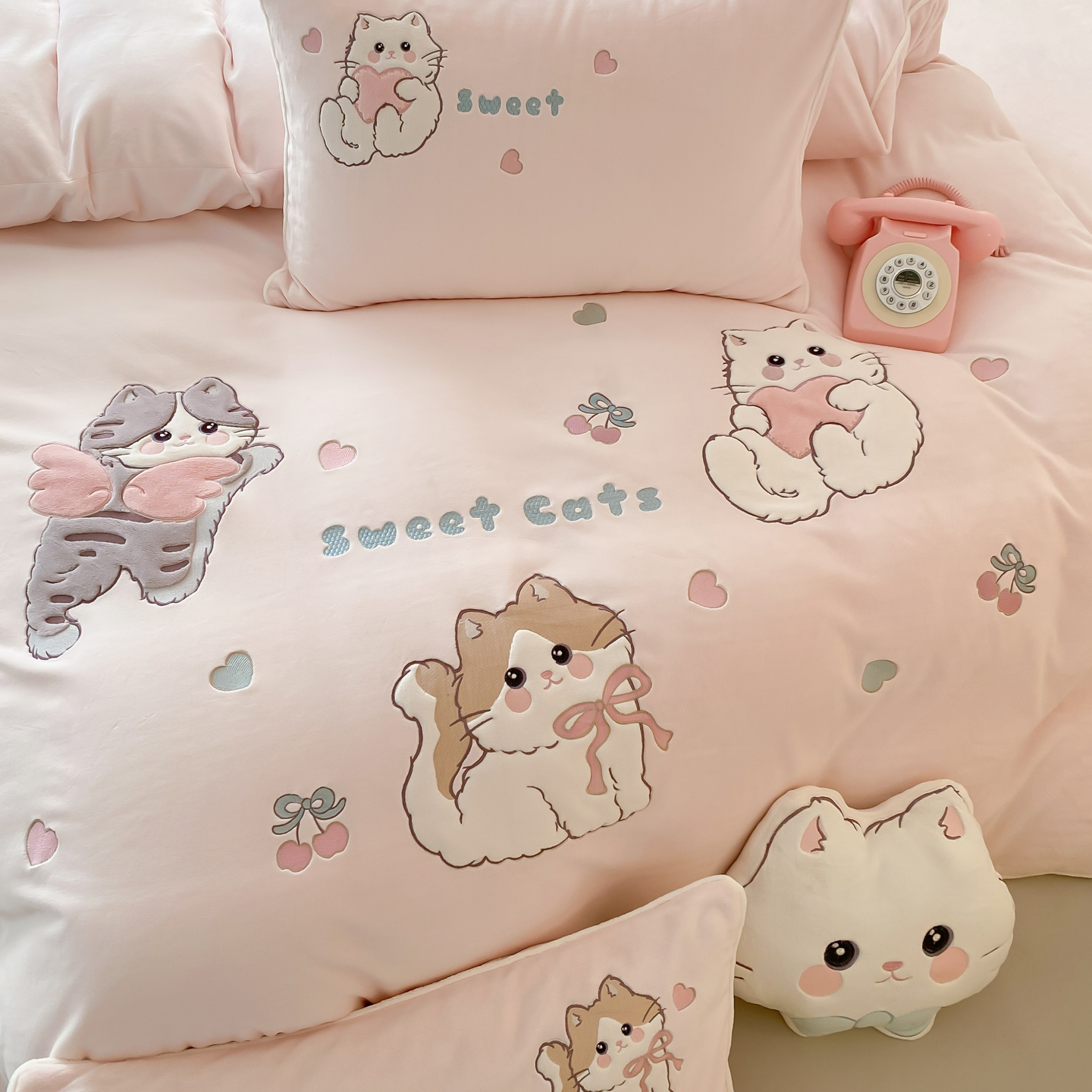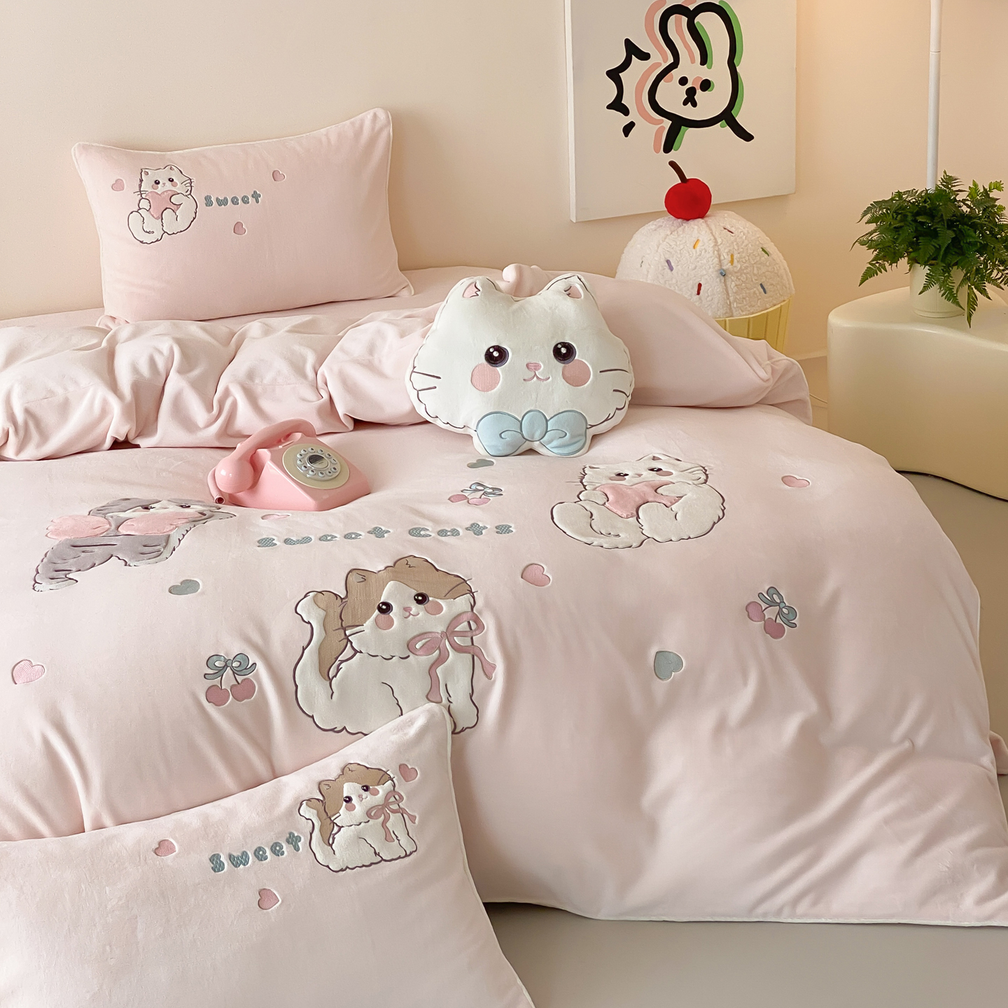 晚安猫猫咪冬季卡通少女加厚牛奶绒四件套被套床单儿童公主风床品