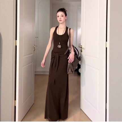 【棉高品质】咖啡配三角巾u领无袖工字背心连衣裙女夏显瘦长裙
