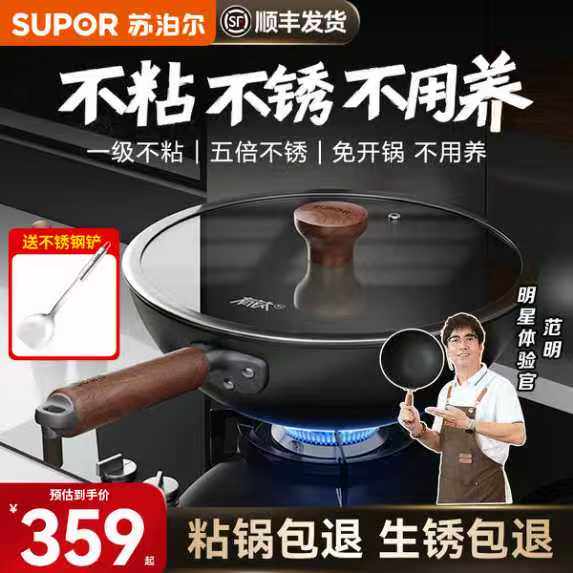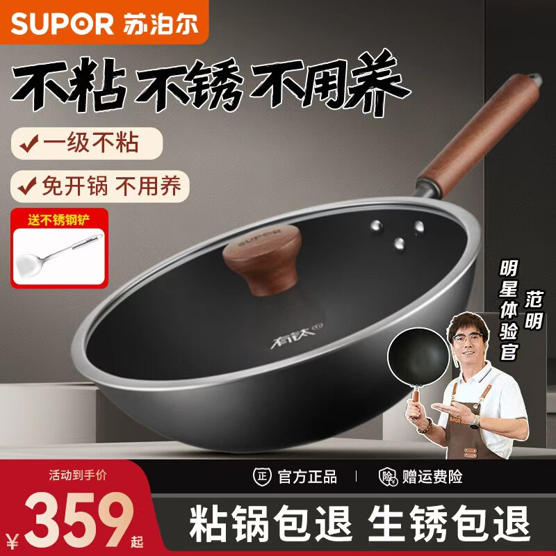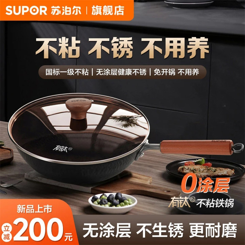 苏泊尔铁锅不粘锅有钛无涂层炒锅家用炒菜锅免开锅电磁炉燃气专用