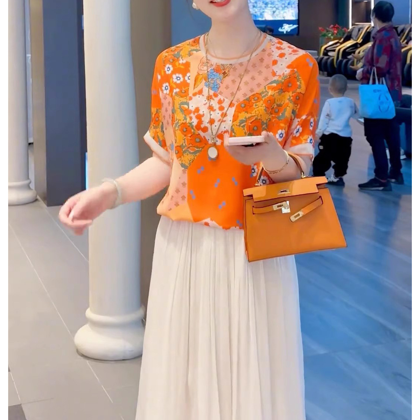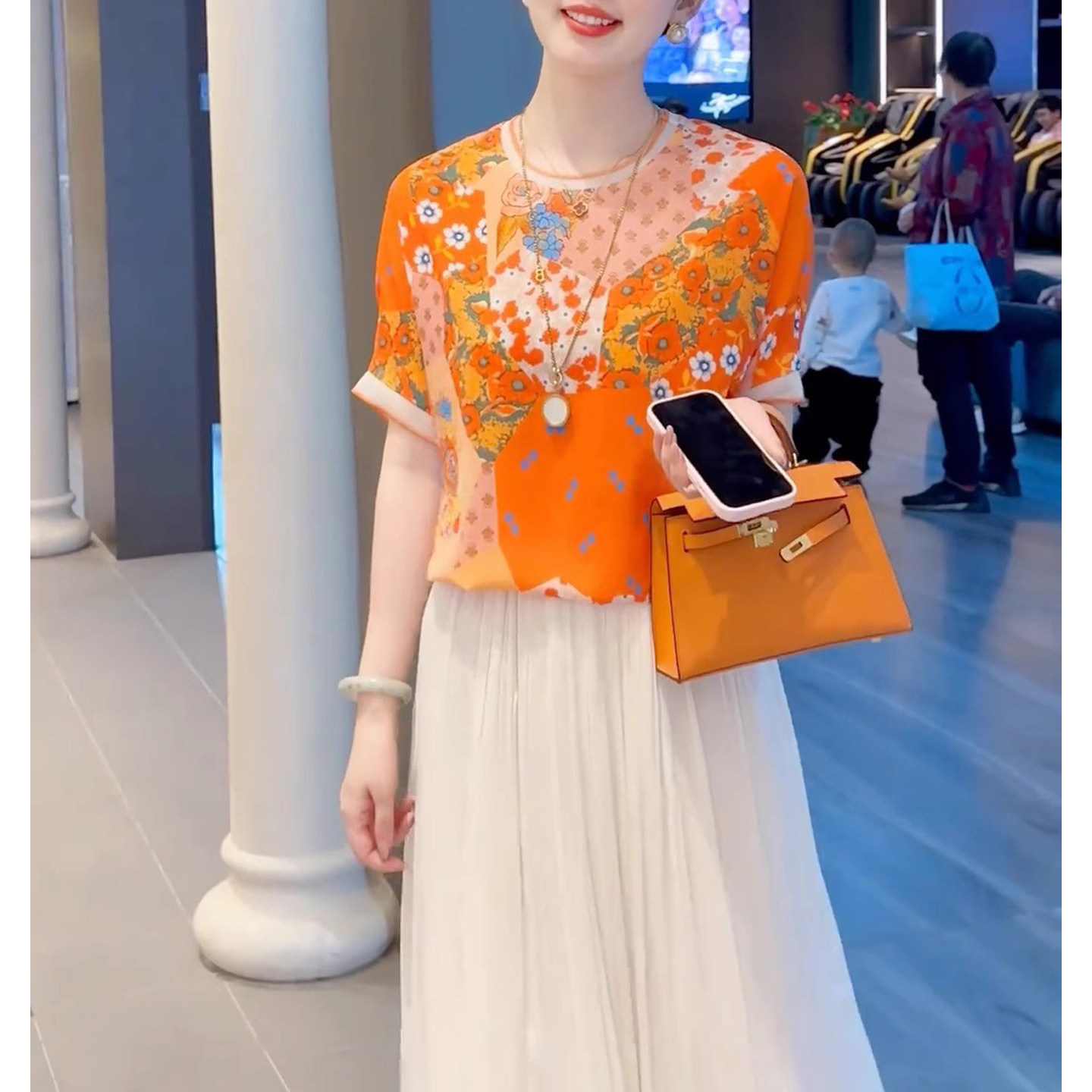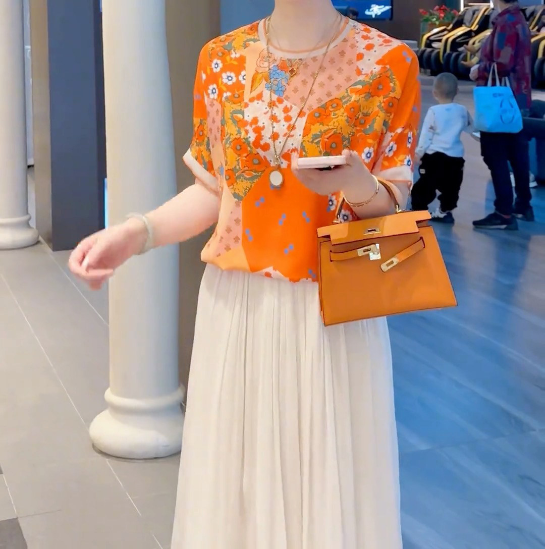 2025年夏季时尚洋气减龄圆领上衣橘红色印花短袖小衫漂亮雪纺衫女