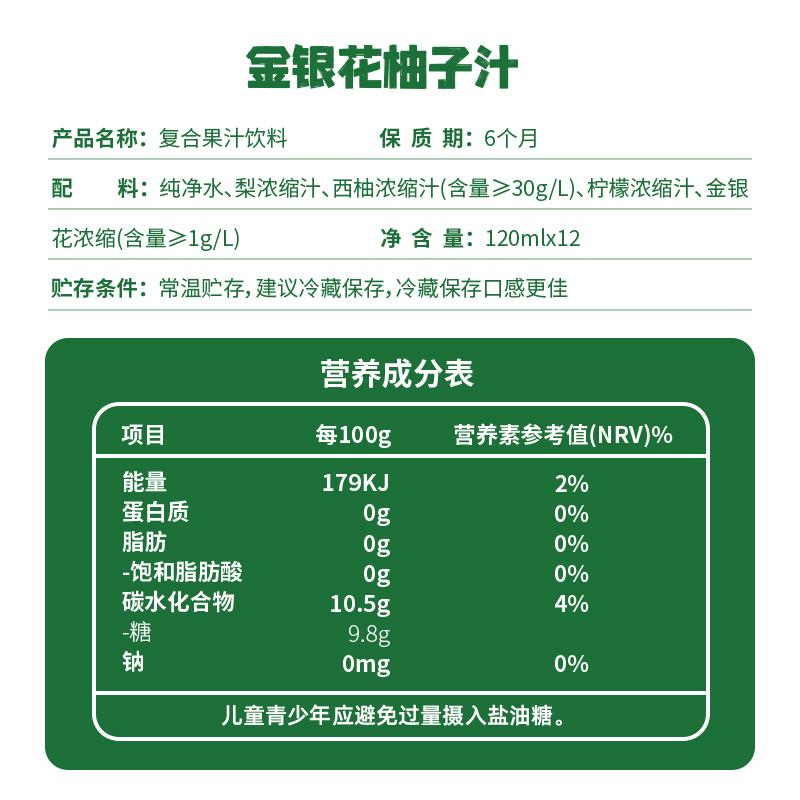 熙景源金银花柚子汁果汁饮料120ml*12袋酸甜清润草本植物果茶儿童