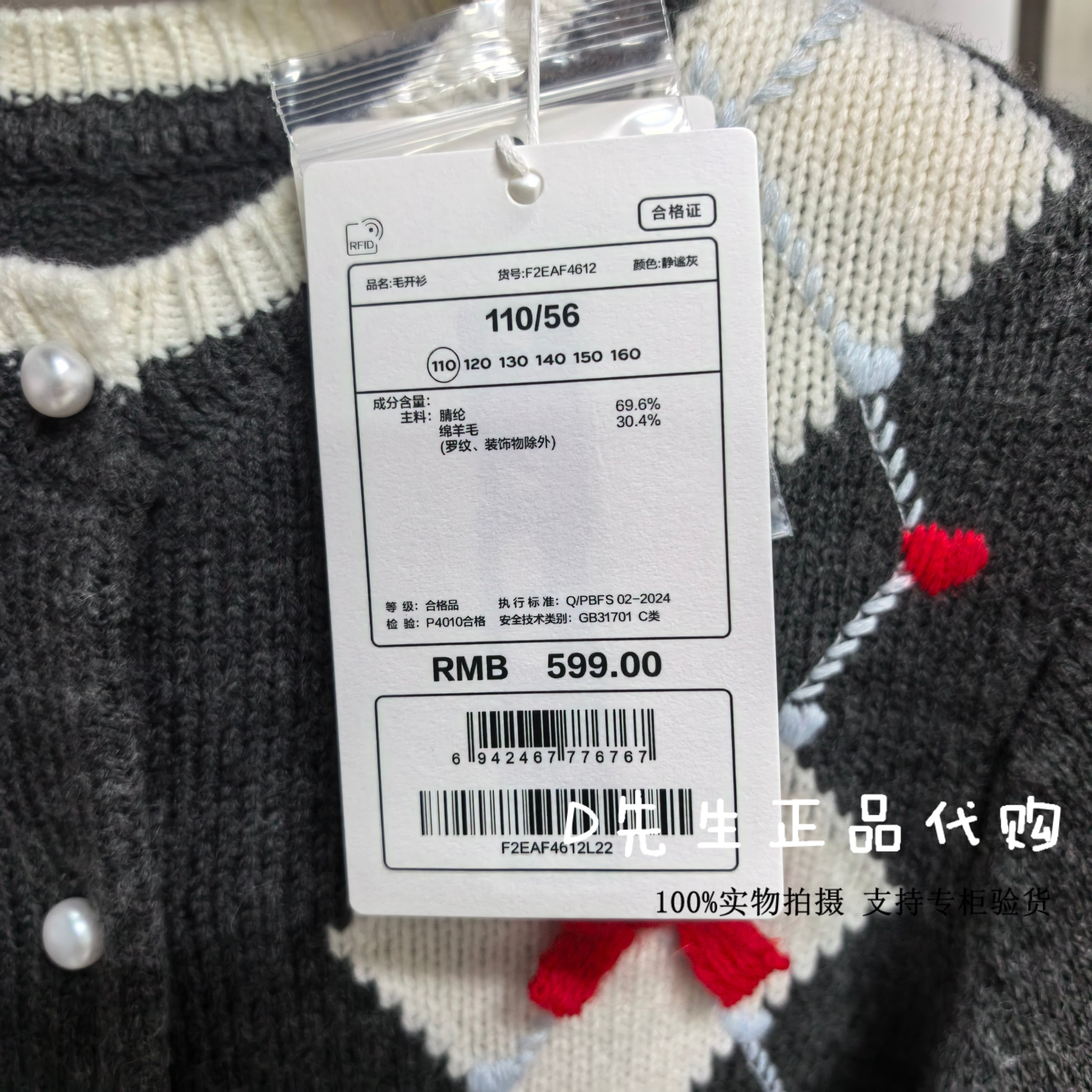 F2EAF4612 mini peace太平鸟童装2025冬装新款女童针织毛开衫 599