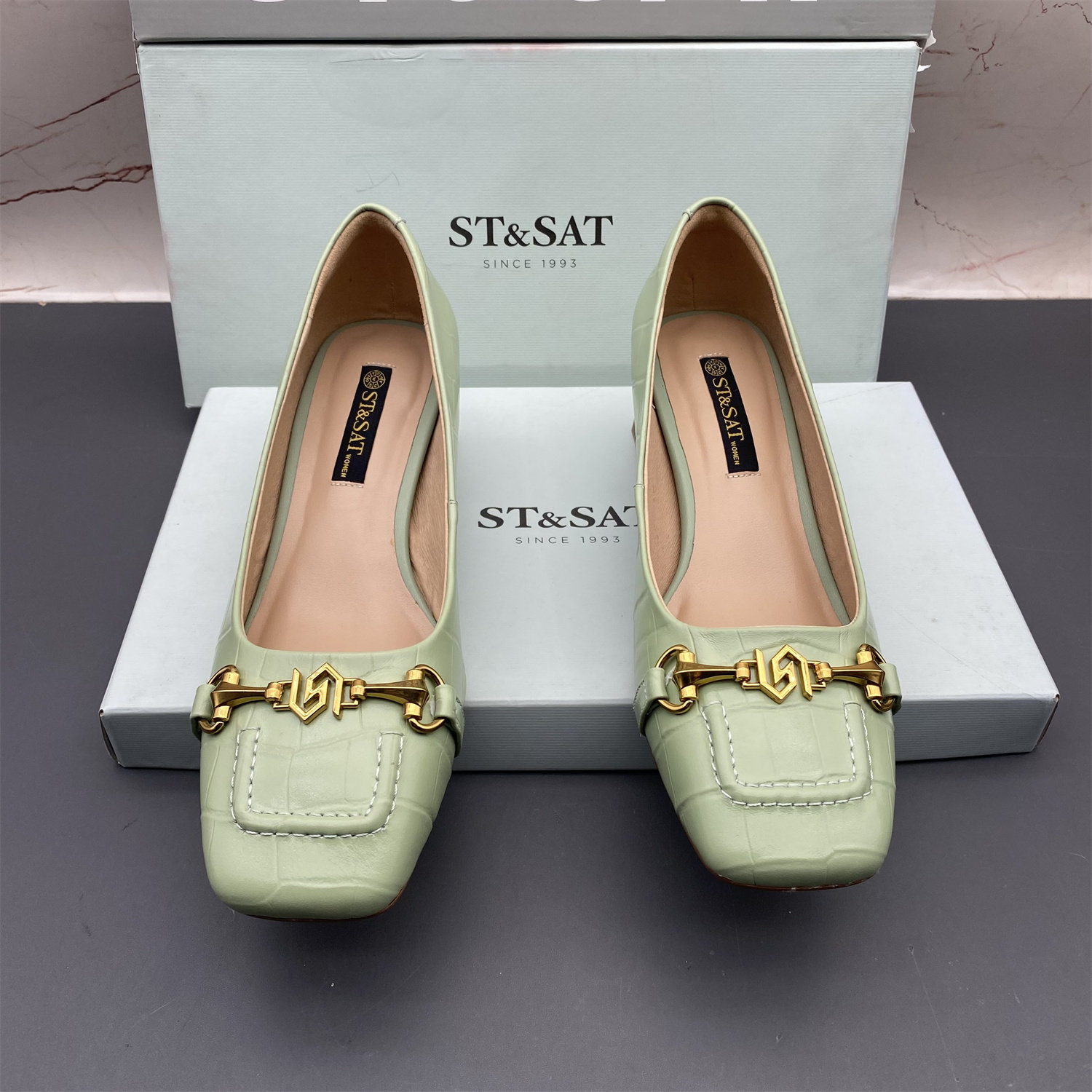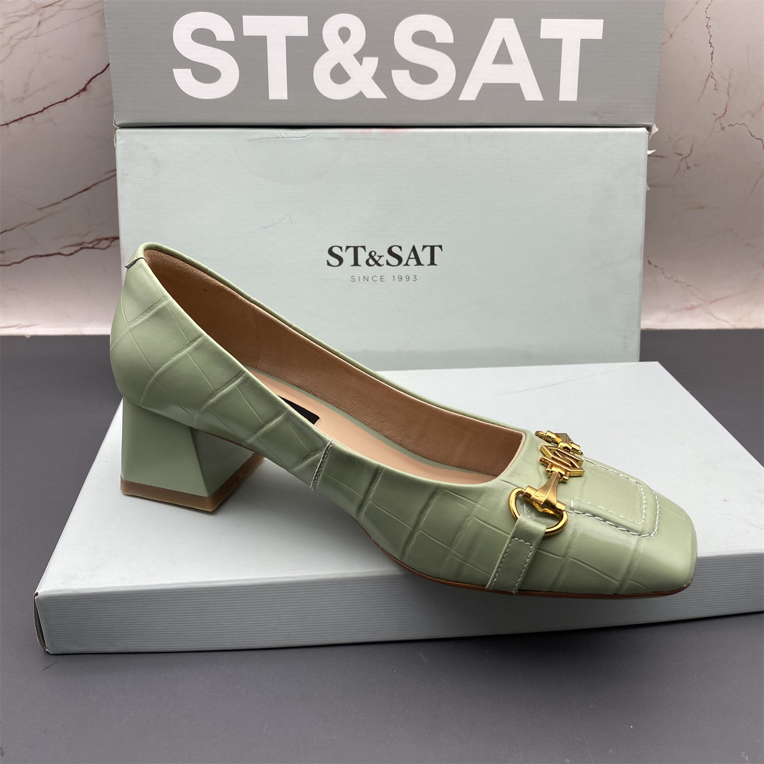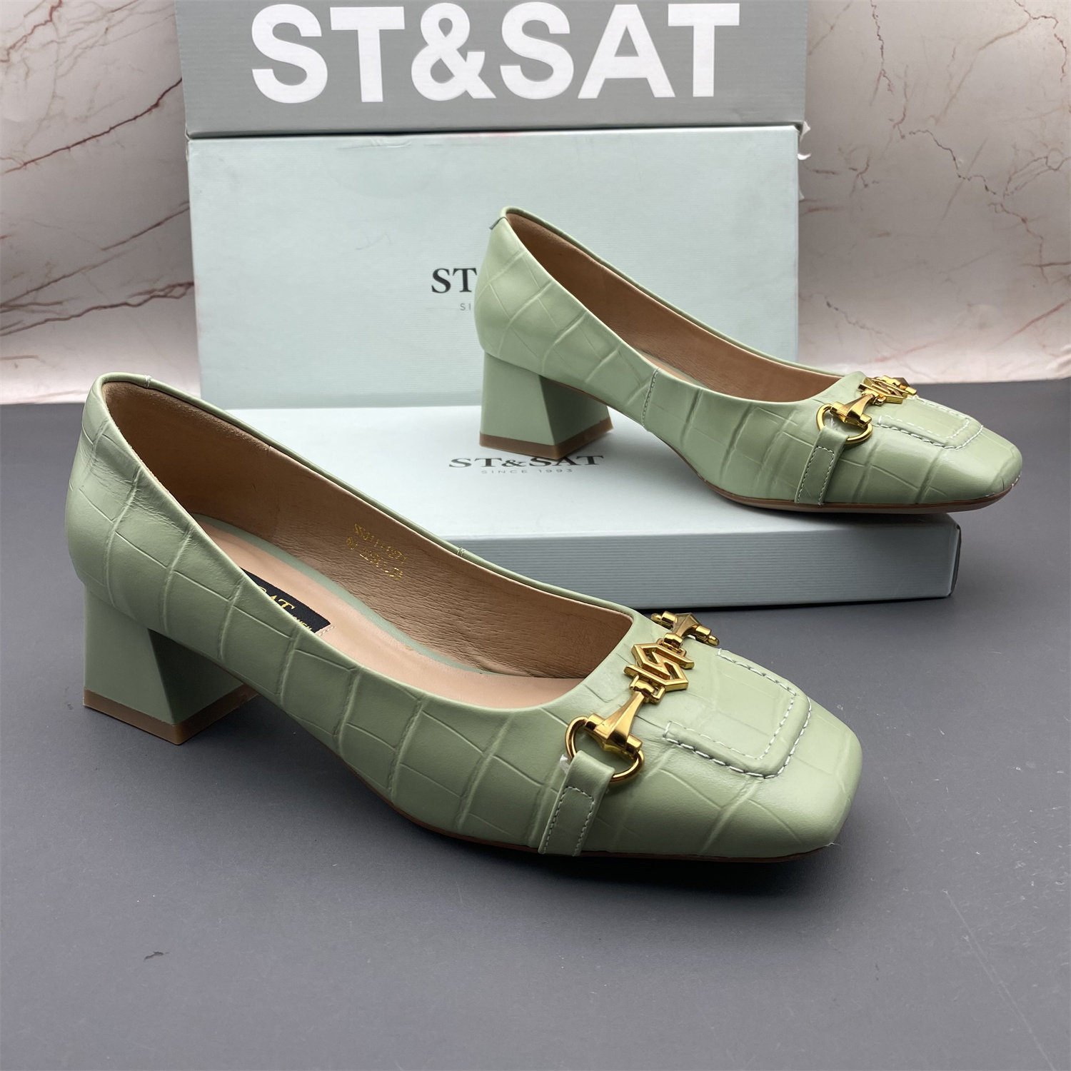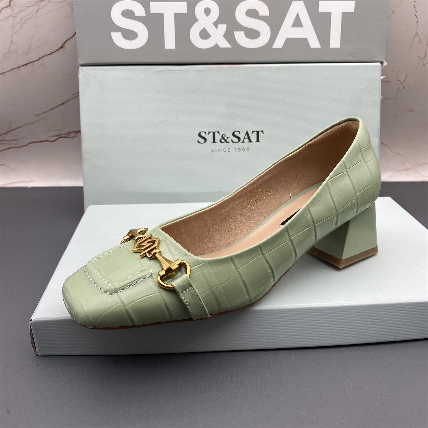 正品ST&SAT星期六撤柜断码牛皮女鞋粗跟中跟压纹浅口方头时尚单鞋