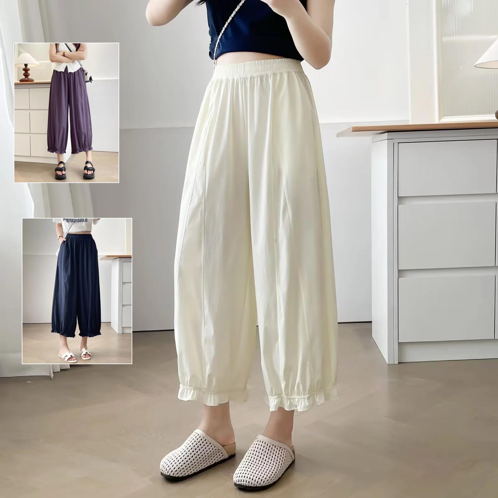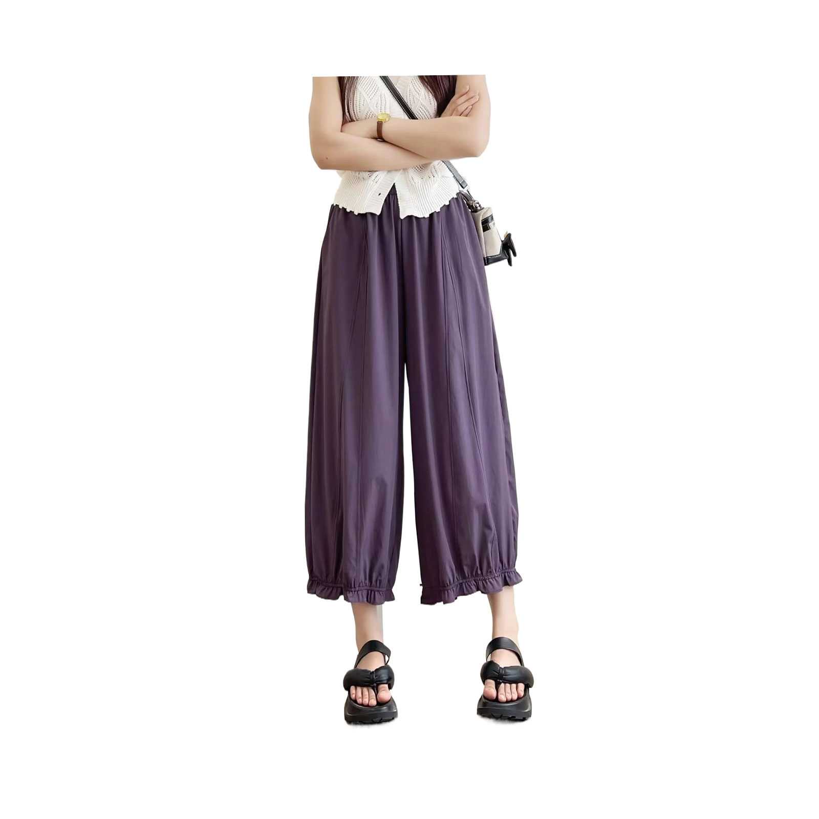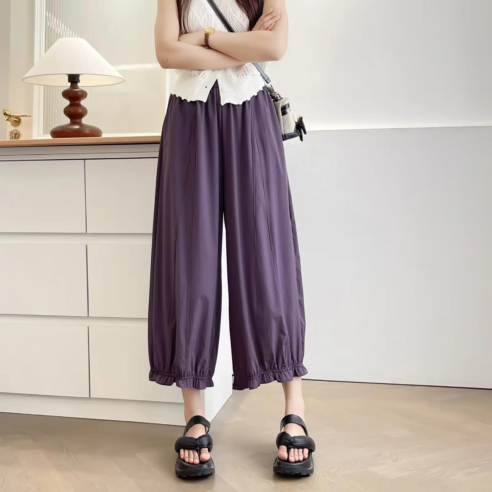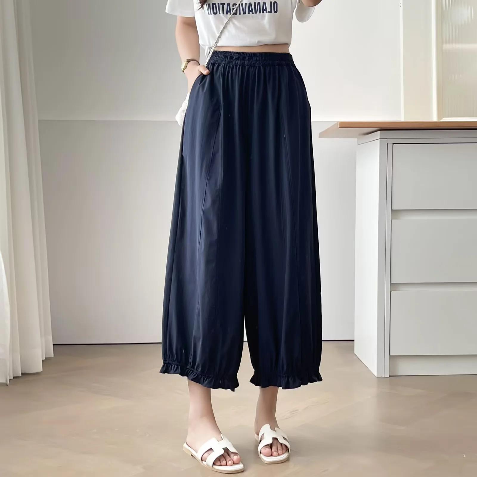 胖妹妹新款女装夏装褶皱纯色大码松紧腰八分裤海棠裤200斤女裤子