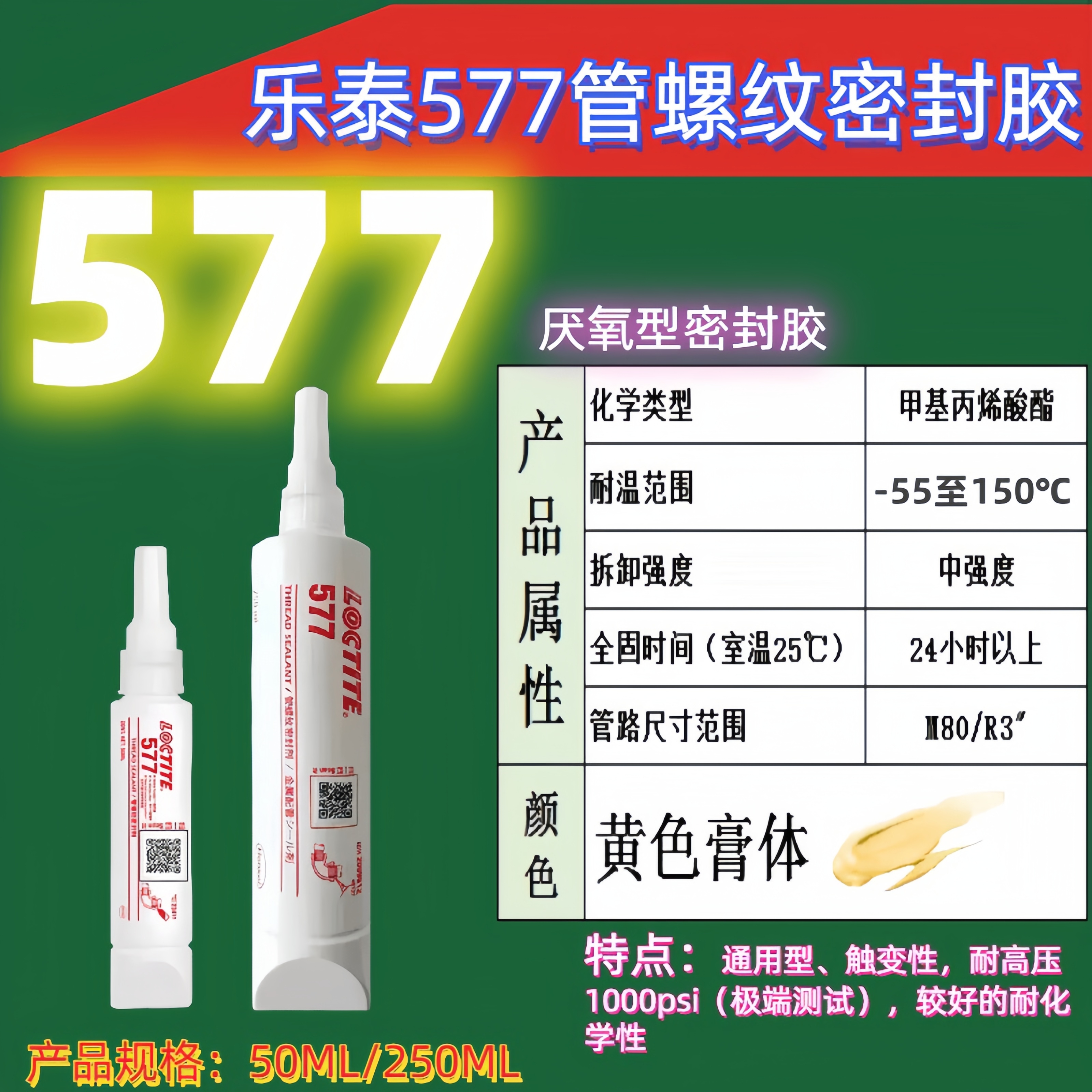 中强度触变性577管螺纹密封剂 液态生料带水 乐泰管密封胶 可拆卸50ml/250ml易拆卸耐高温金属螺纹厌氧胶水