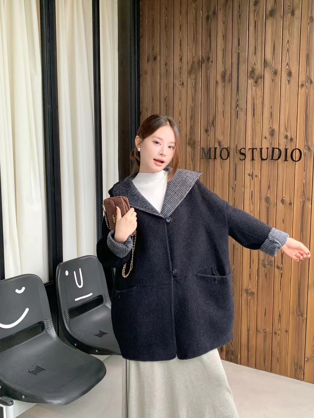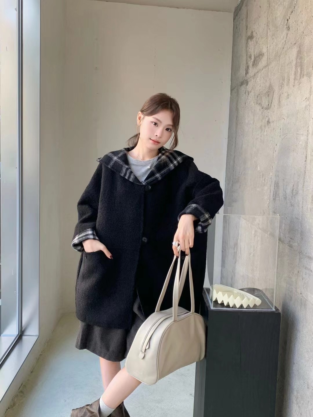 韩国定制SEVEN格子双面羊绒外套女慵懒宽松中长款羊毛大衣冬季