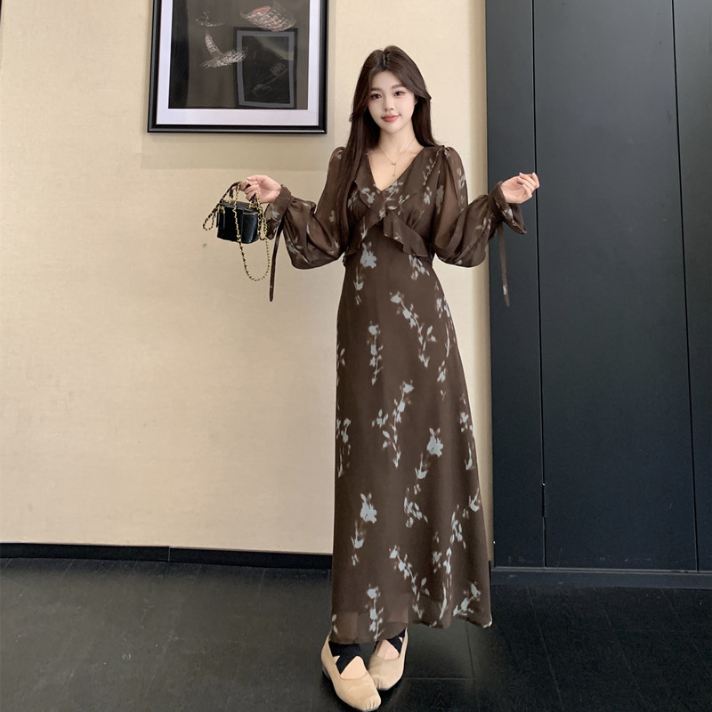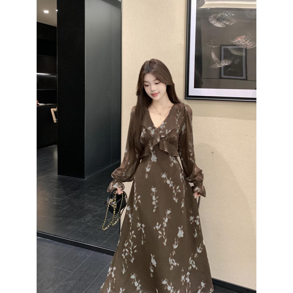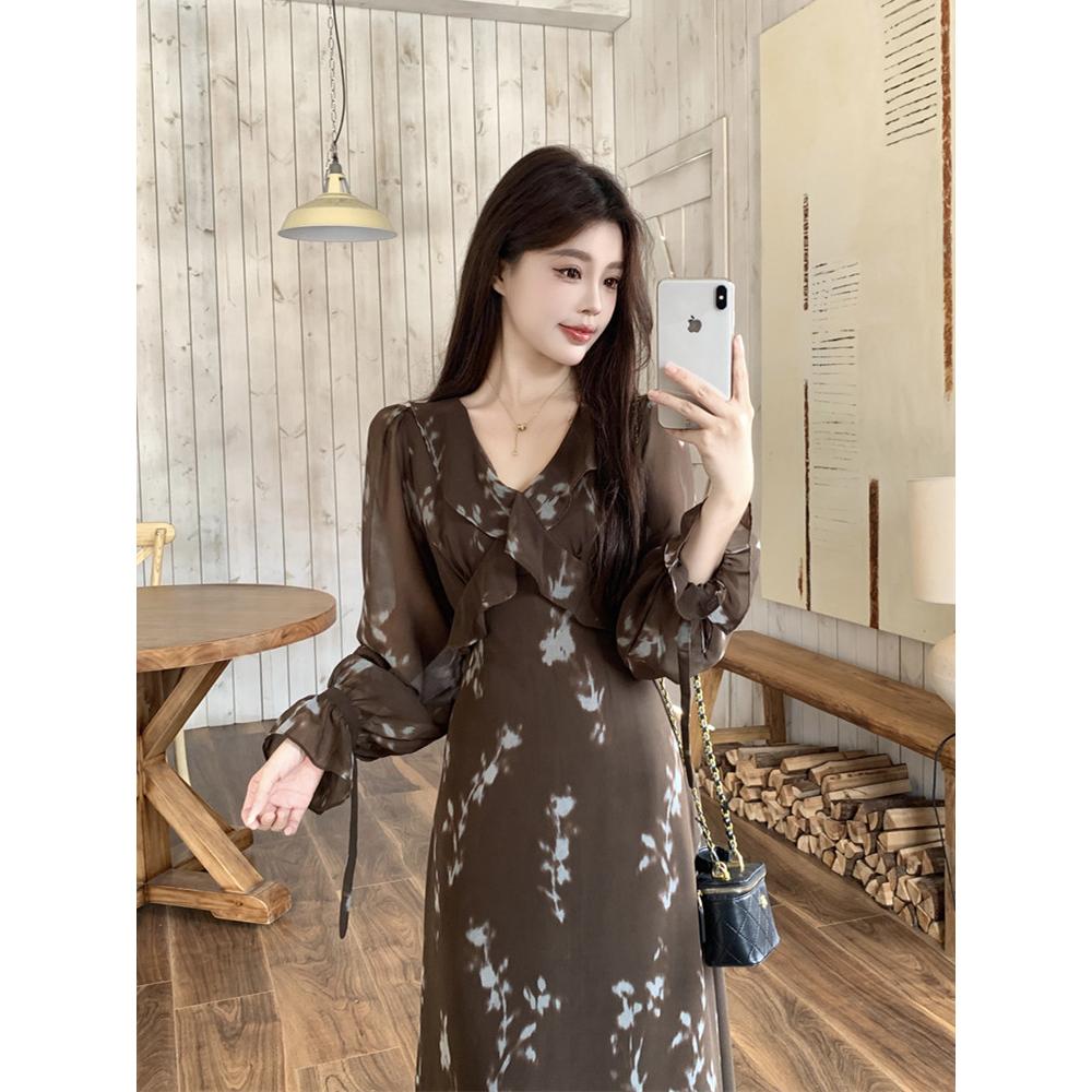 大码女装秋季胖MM浪漫荷叶边收腰连衣裙法式气质灯笼袖长裙